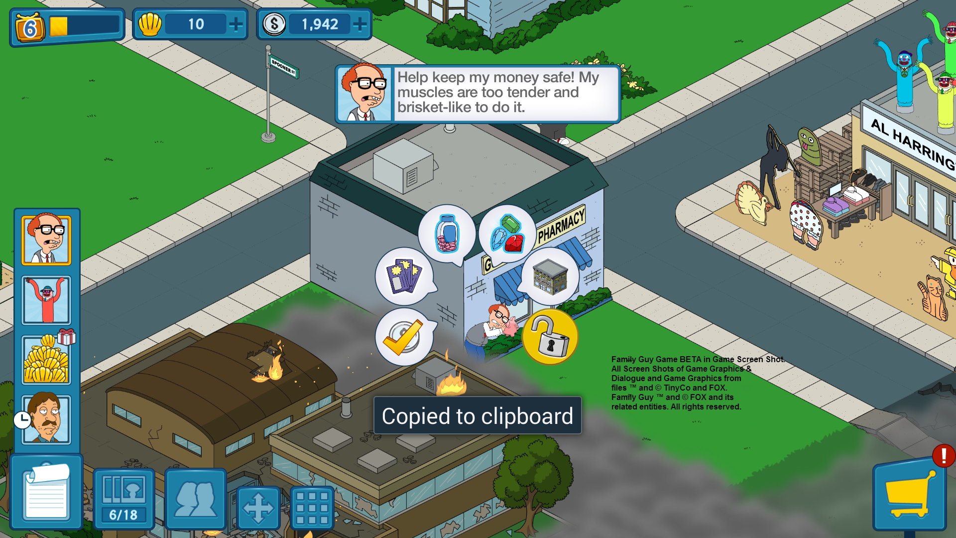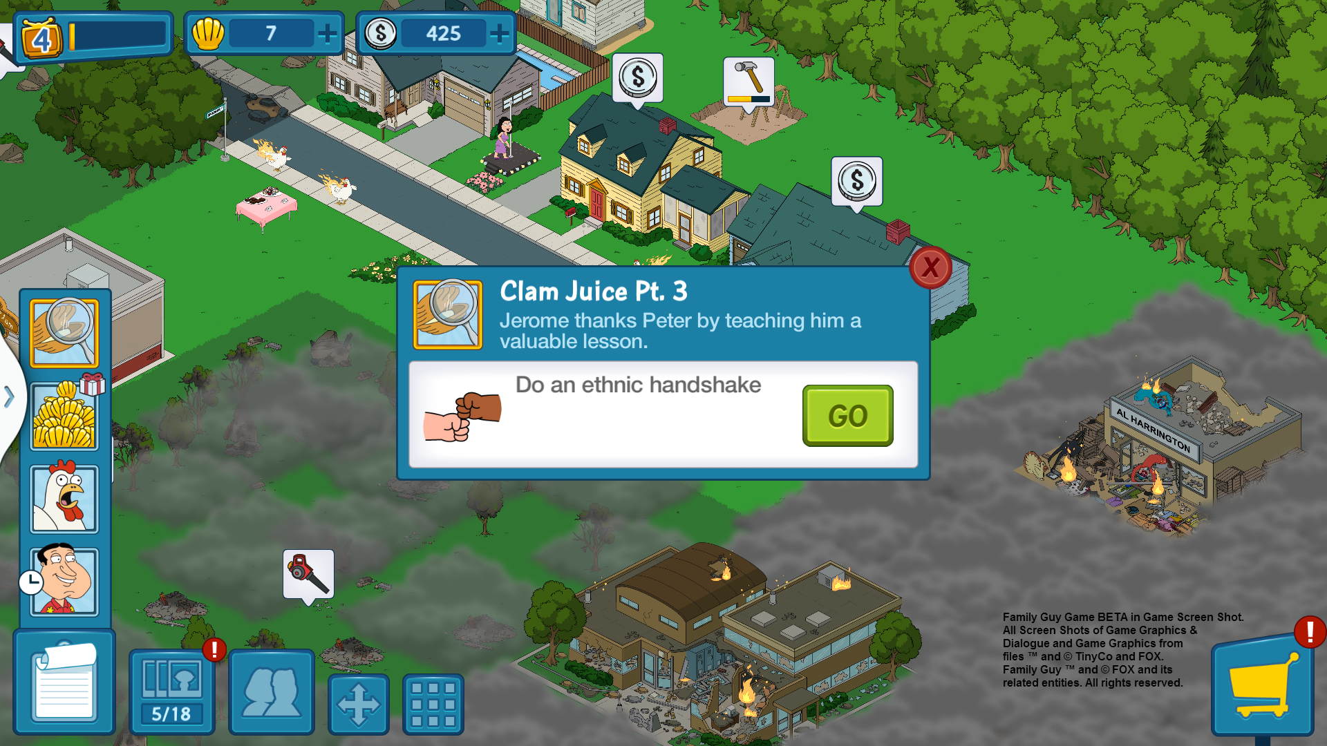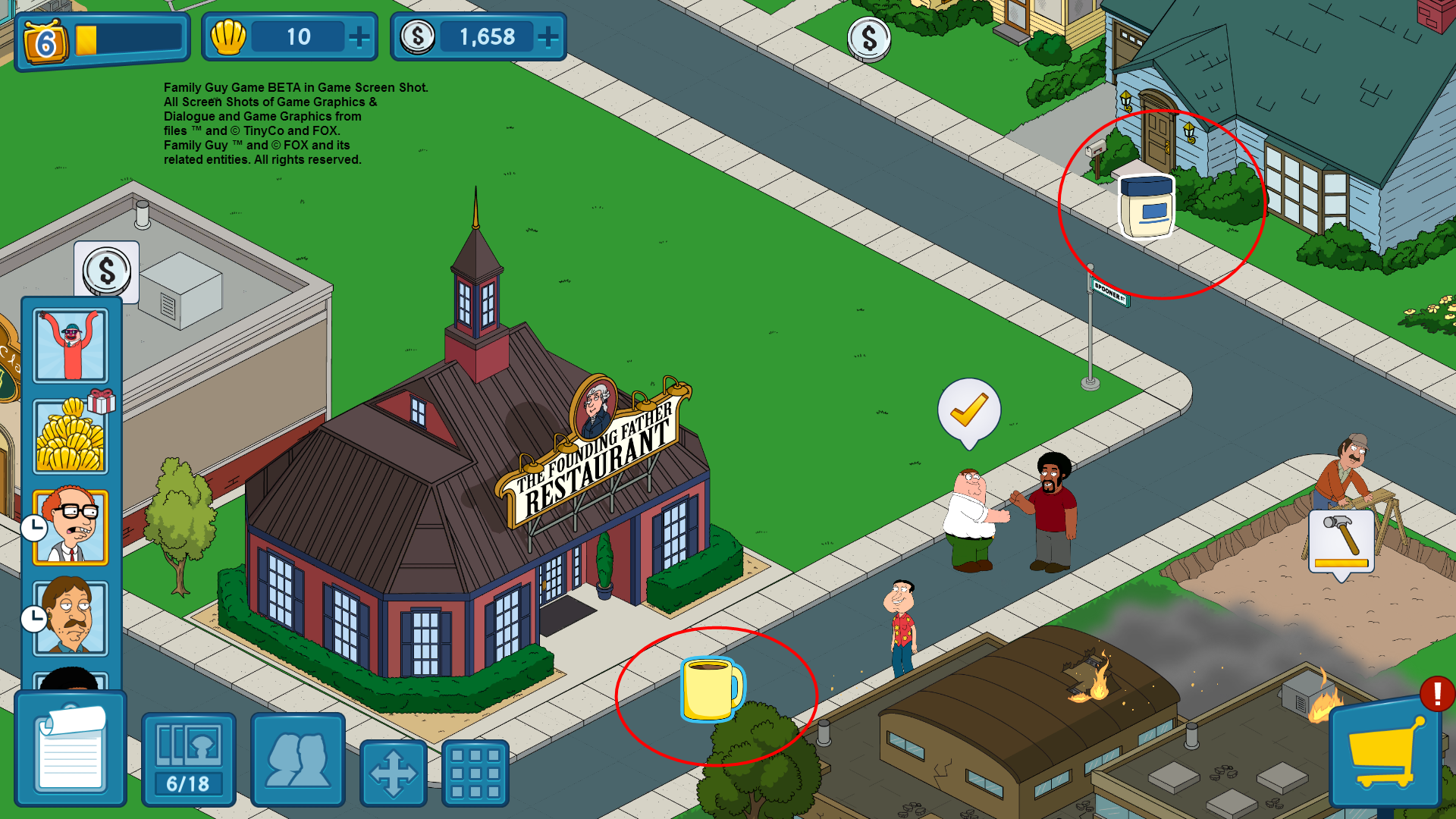 Much like other mobile games, where you’re tasked to rebuild a city for scratch, the Family Guy Game comes with quests for each character that lead to being able to unlock more buildings and sections of Quahog. Those quests are usually multiple parts and contain humorous dialog and animations by the characters. Here’s a few shots our friend sent us showing part of the tasks and some of the animation: