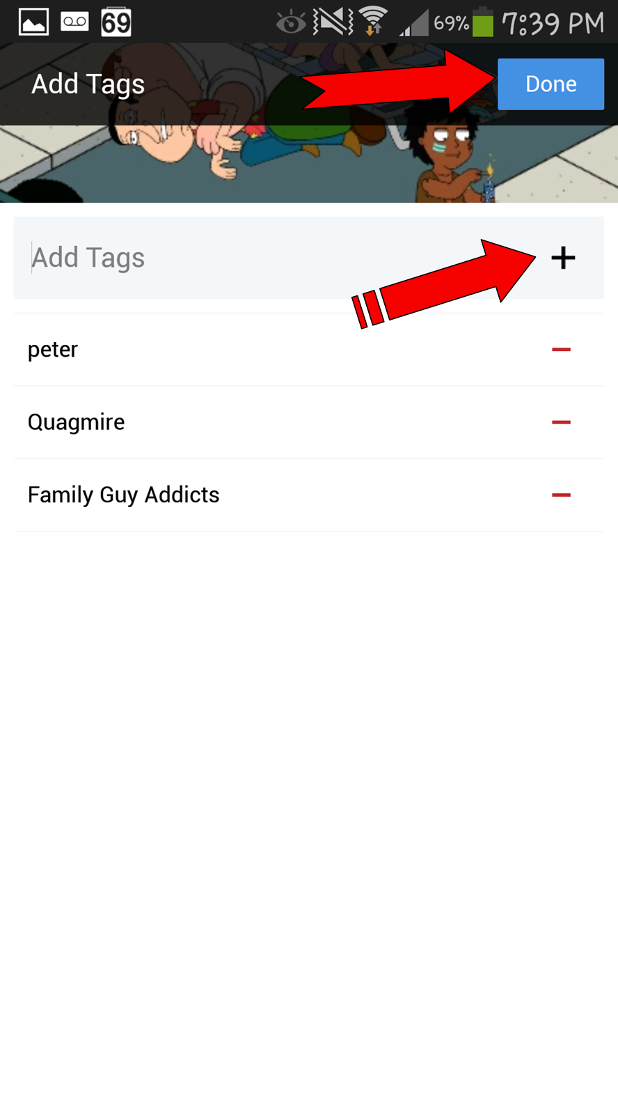 There I will select the Family Guy Addicts Group (you will see a check mark next to it now.) It is VERY IMPORTANT that no matter which Advanced option you are in, you HAVE to select “Done” or it will not save your additions.