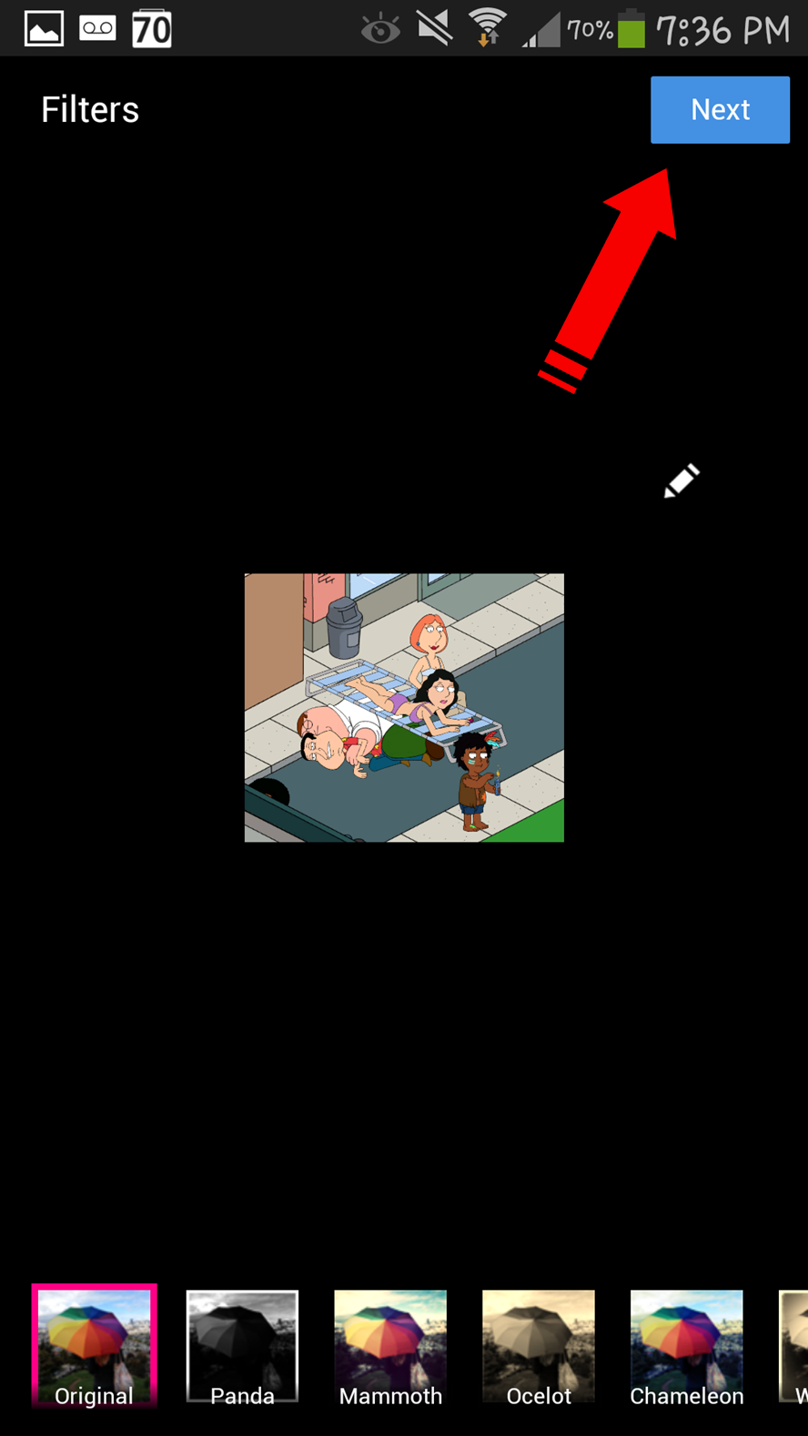 Now I am in the editing “Filters” screen of my phone. I can edit the image color to suit what I want it to look like before proceeding. I can select ‘Next” to keep going or, at this point, I can click on the lil pencil looking icon to enter the Photo Editor to make even further changes to the picture. Once I am finished editing, I just select “Done” and it returns me right back to the previous screen.