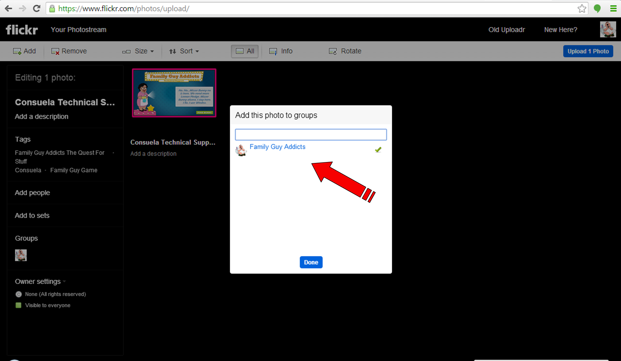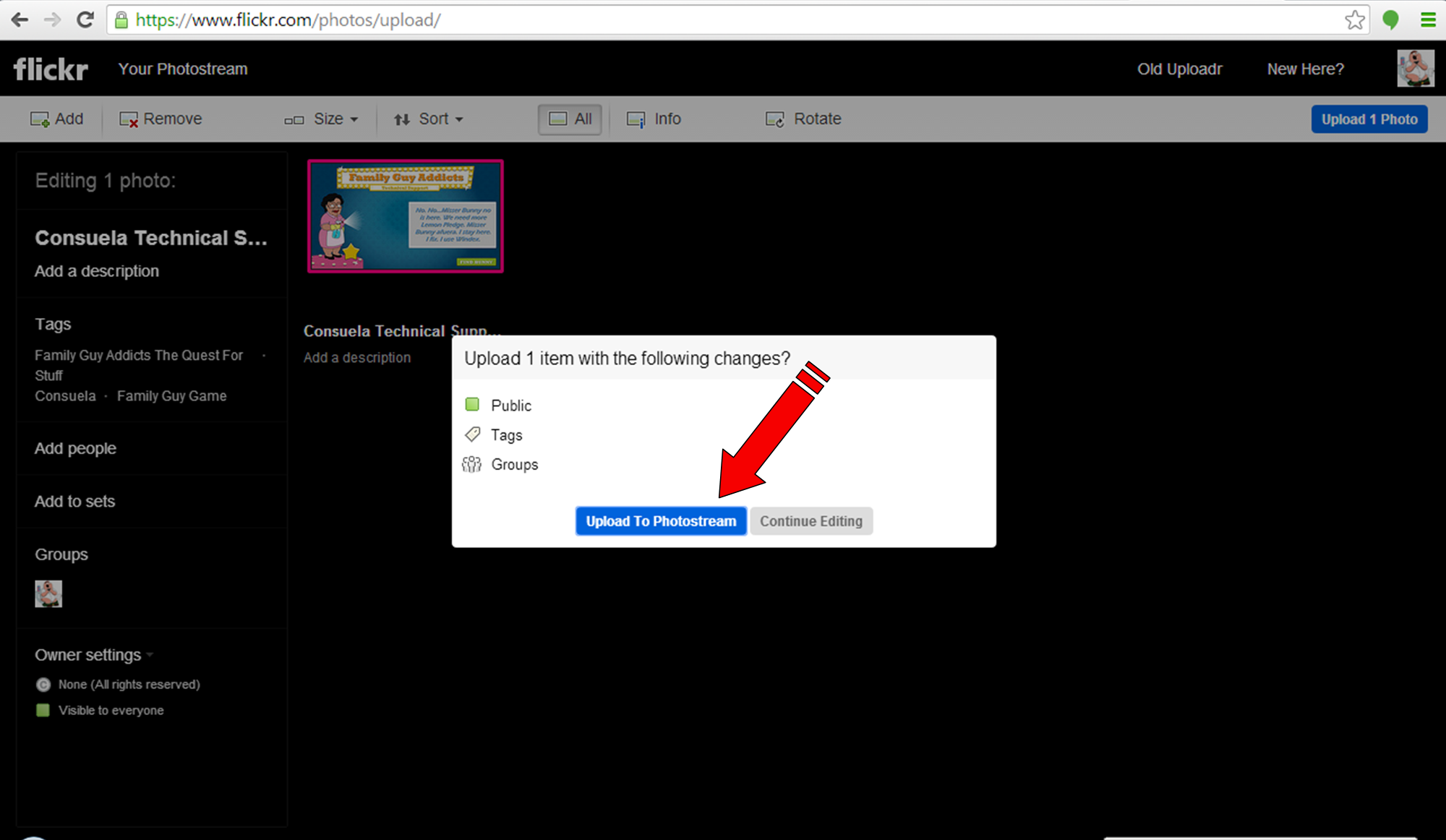 A cool feature here is the “Add to groups”. So if you have already added yourself to our group, Family Guy Addicts, then you can use this feature to also automatically Upload the photos to our pages photostream.