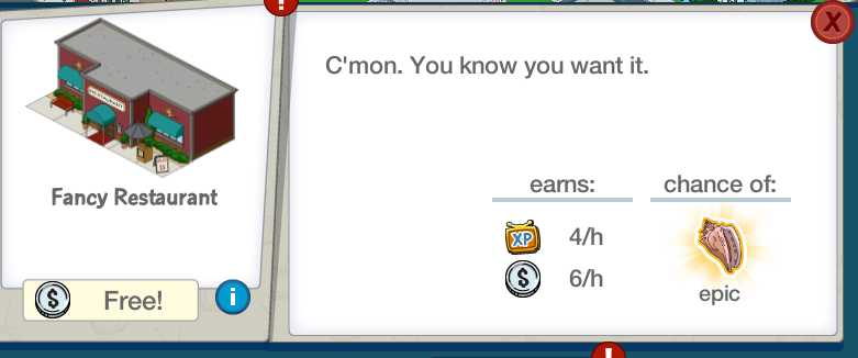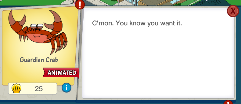 I love the fancy restaurant– which is an added bonus– for buying the three exotic animals. At 100 clams, the Peterdactyl is the most expensive decoration I’ve bought in the game, thus far (I still want that Crippletron but won’t shell out– pun intended– 750 clams for it). I’ve always wanted that Peterdactyl so the fact that they lowered the price for it by 400 clams is a big plus for me. Comparatively, we’ve had more expensive NPCs in Tapped Out– 150 donuts for Santa’s Little Helper– for example, and the other NPCs that are over 50 donuts (Mojo from Easter), the tiger and the crab at 50 and 20 clams, respectively are a bargain– plus it comes with a unique restaurant if we get all 3. 🙂 Just my opinion, of course.