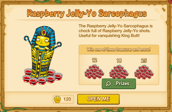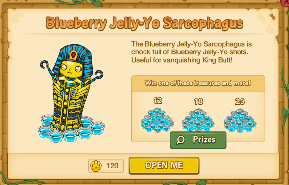 This event has been a huge gamble and many players have wasted their clams on it. I’m disappointed in this app for taking advantage of its new customers. I’m still playing the game, but I hope to see the prices of premium items dwindle as players become more and more annoyed with TinyCo’s antics. My opinion on the sarcophagus is that you should NOT get it. I got a few and when the streak meter hit 50x, I was expecting THOUSANDS of moon idols (just as TinyCo had said). But no, all I got was 7500. Now I’m stuck around a score of 80,000 because I was expecting so many more idols from the streak meter. I was expecting King Butt, too (to get him you need a score of 100,000)! Don’t waste any money on the rest of this event, because it’s just that… a WASTE!!!