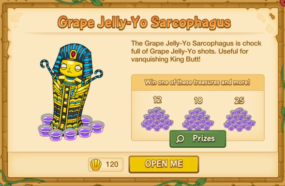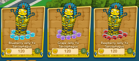 So last night saw another late night update. This time TinyCo added 3 new Sarcophagi to Quahog. While they still cost 120 clams each, these special ones will ONLY drop Jelly-Yo Shots (of various colors). Let’s break down the details….