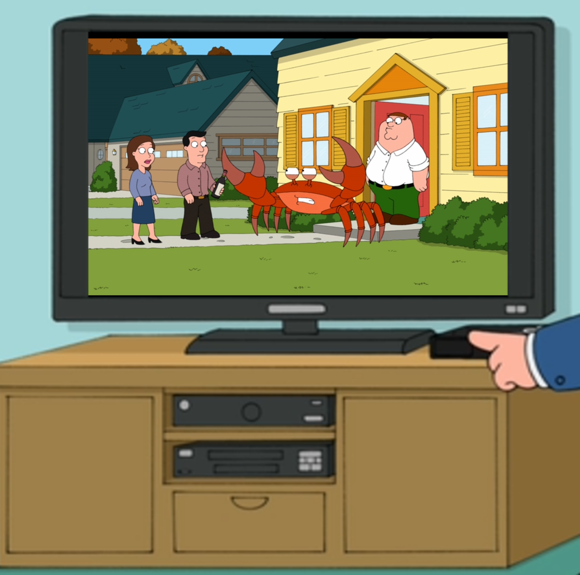 The Griffin’s are getting ready to sit down for Thanksgiving dinner with Bonnie and Joe. Peter is glad they can finally have guests over now that the Giant Crab is gone. Cut away to a scene of visitors attempting to come to the door but are blocked by an annoying Giant Crab that just won’t let them pass by. It just keeps repeating over n over, “Nope nope nope nope nope…” as it goes side to side preventing anyone from reaching the front door.