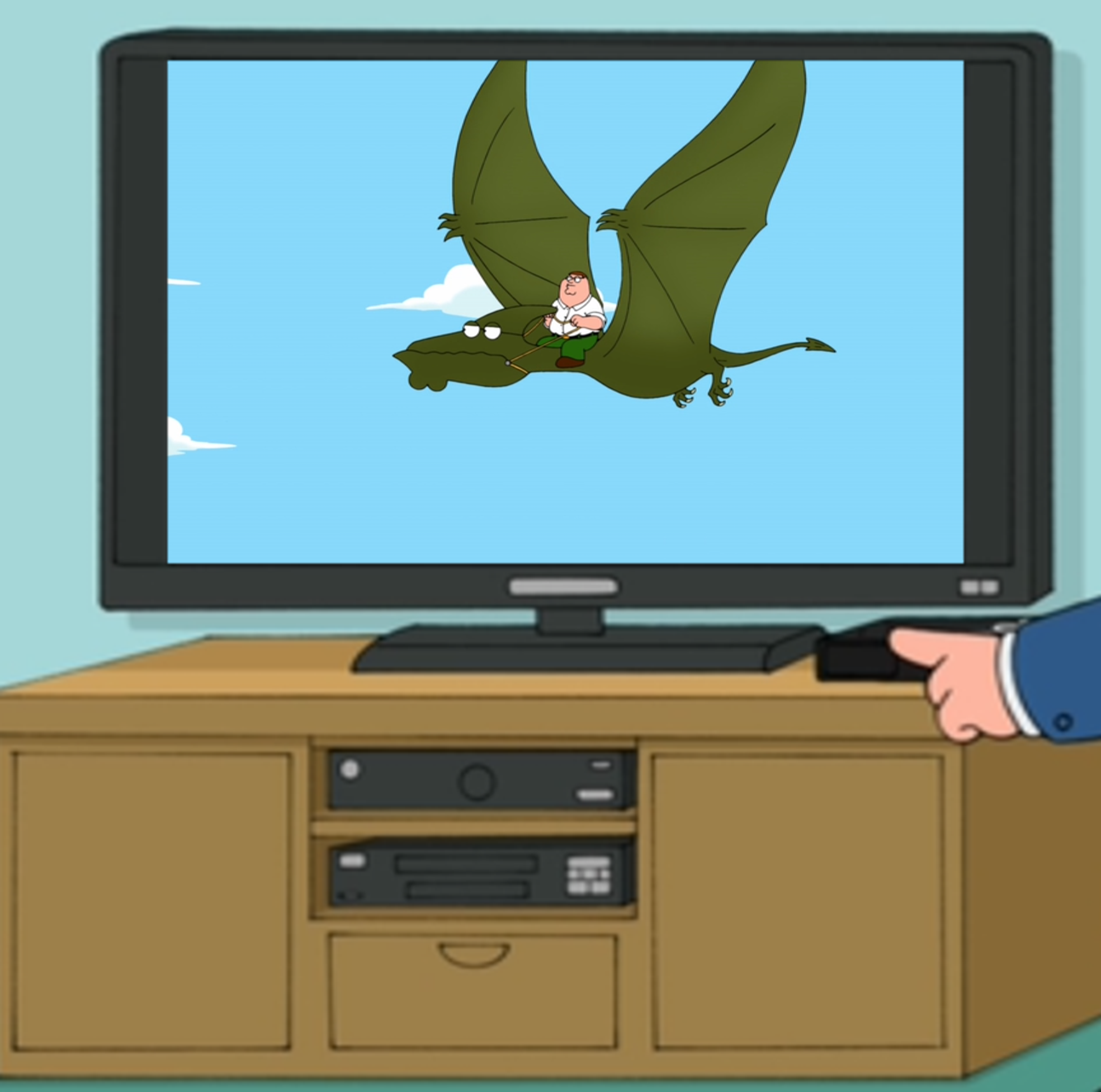 In this Episode, Quagmire is trying to hook up with a now Adult Meg. Peter wants to stop Quagmire from taking her to his cabin as he knows what goes on there. Peter takes the Pterodactyl that looks like him and rides it to save Meg. As with all the other things he attempts to fly, he crashes it …into power lines …and kills it. He then realizes that it had babies and now has to take care of them. So he expels some “food” into their mouths from his stomache. Yummy!!