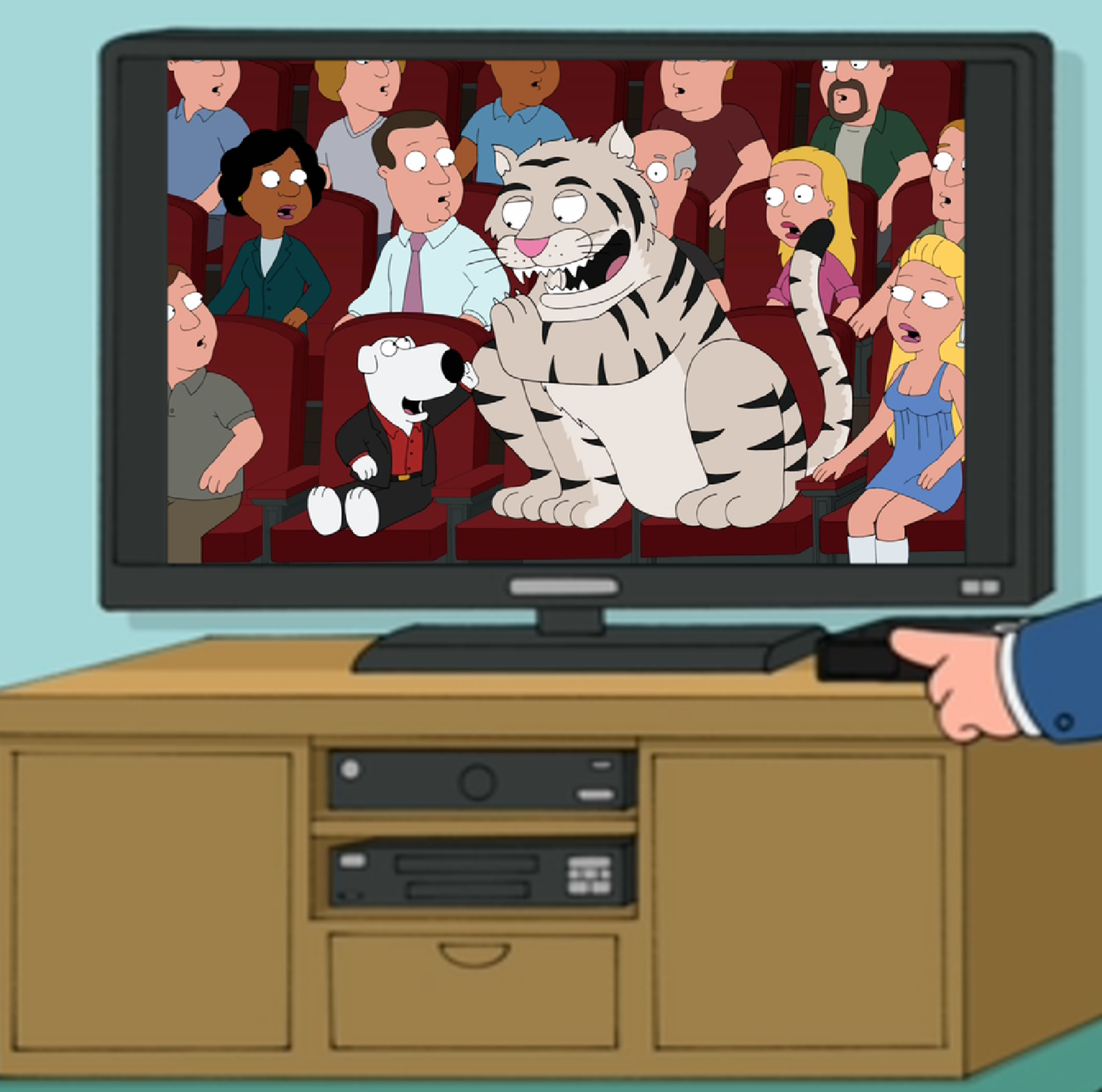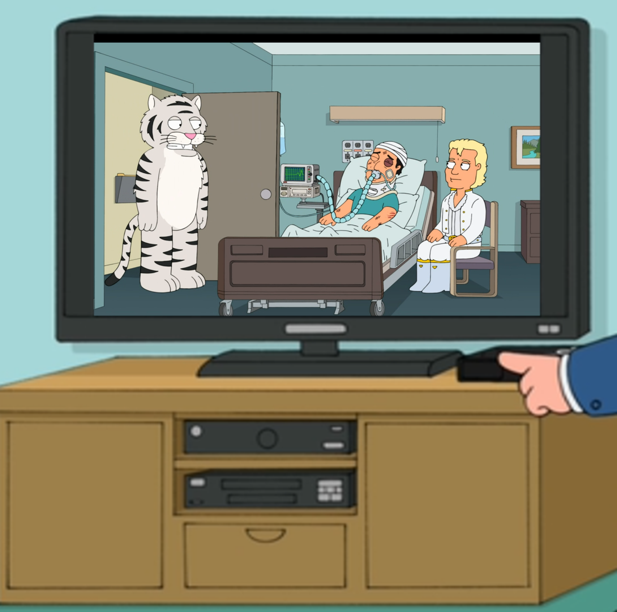 This one is a kinda inside joke item. The White Tiger it is actually mimicking is the one called Mantecore owned by Seigfried & Roy’s Las Vegas show. The same one that attacked and nearly killed Roy during one of their shows. In this episode, Brian is sprayed by a skunk and forced to live outside until the smell goes away. As he is an inside dog, he flips out he won’t make it. After several days, he is looking very wild. Stewie points out his smell is gone and he can now go back inside, but Brian refuses while snarling and biting at him. Stewie says he has turned wild, just like that Tiger that attacked Roy. Cut away to a scene of Roy laying in a hospital bed torn up. Mantecore enters and asks if he needs to get checked. (Hinting that Roy has a disease and he now has it after biting him.)