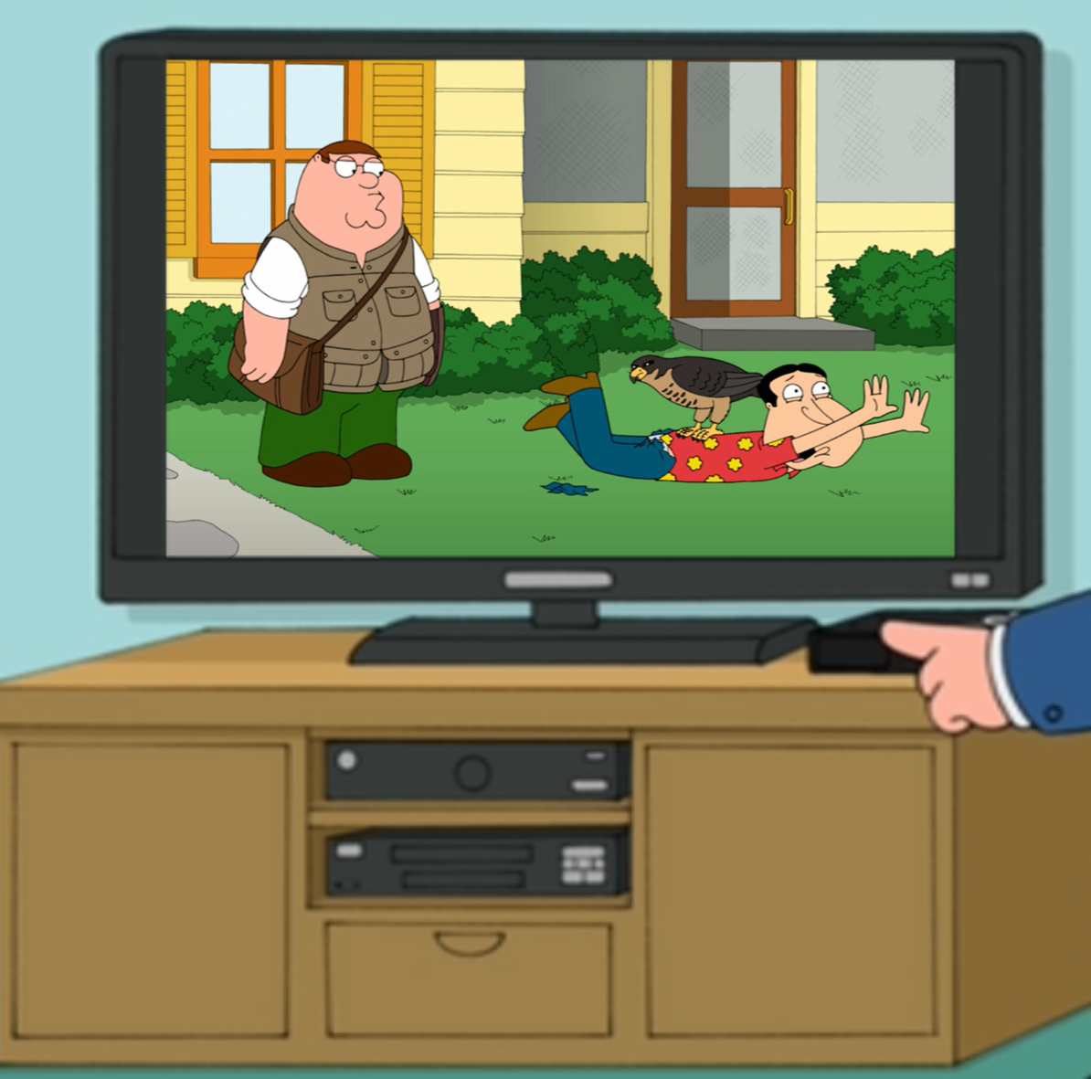 Chris came home excited with the new Benson style bird house he just built. He couldn’t wait to hang it up outside to see what birds moved in. While him and Peter were admiring all the cute new lil blue birds, a falcon swooped down and massacred them all. Peter and Chris where in shock. They had no idea what kind of bird it was.