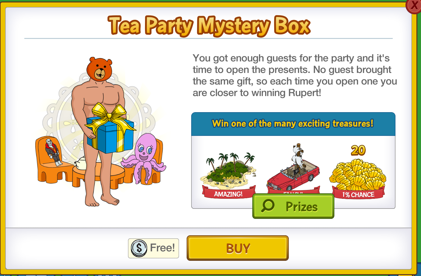 Maybe someone can answer this. Has anyone got Rupert from any box other than the third one? I have unlocked all three tea parties 2 days in a row and 2 on the first day. Still no Rupert…… I will only be able to do one more before the event expires. My girlfriend got him the second day on her third box. So I’m just curious.