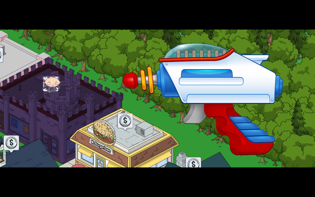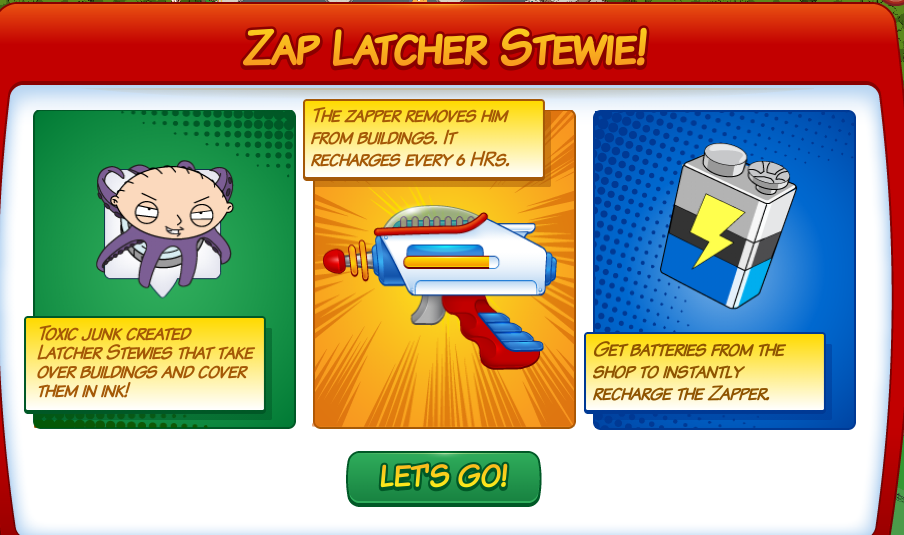 Mutant Stewie is out for revenge and will hold your Celebrities hostage (And your buildings too)! In order to stop him you’ll have to Zap him. In order to get the zapper in your Quahog you’ll have to complete Part 6 of Quahog Comic-Con questline (where you unlock the Convention Center)