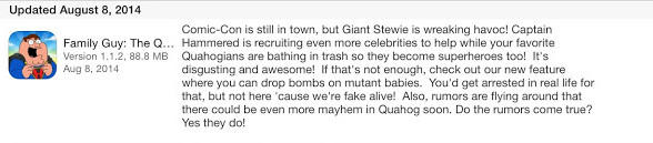 So for 95 clams you can buy pesticides to help you defeat Stewie faster. And so far those are the details of the weekend event that stopped Quahog. I’m sure there was more planned (at least based on the description from the app stores)…