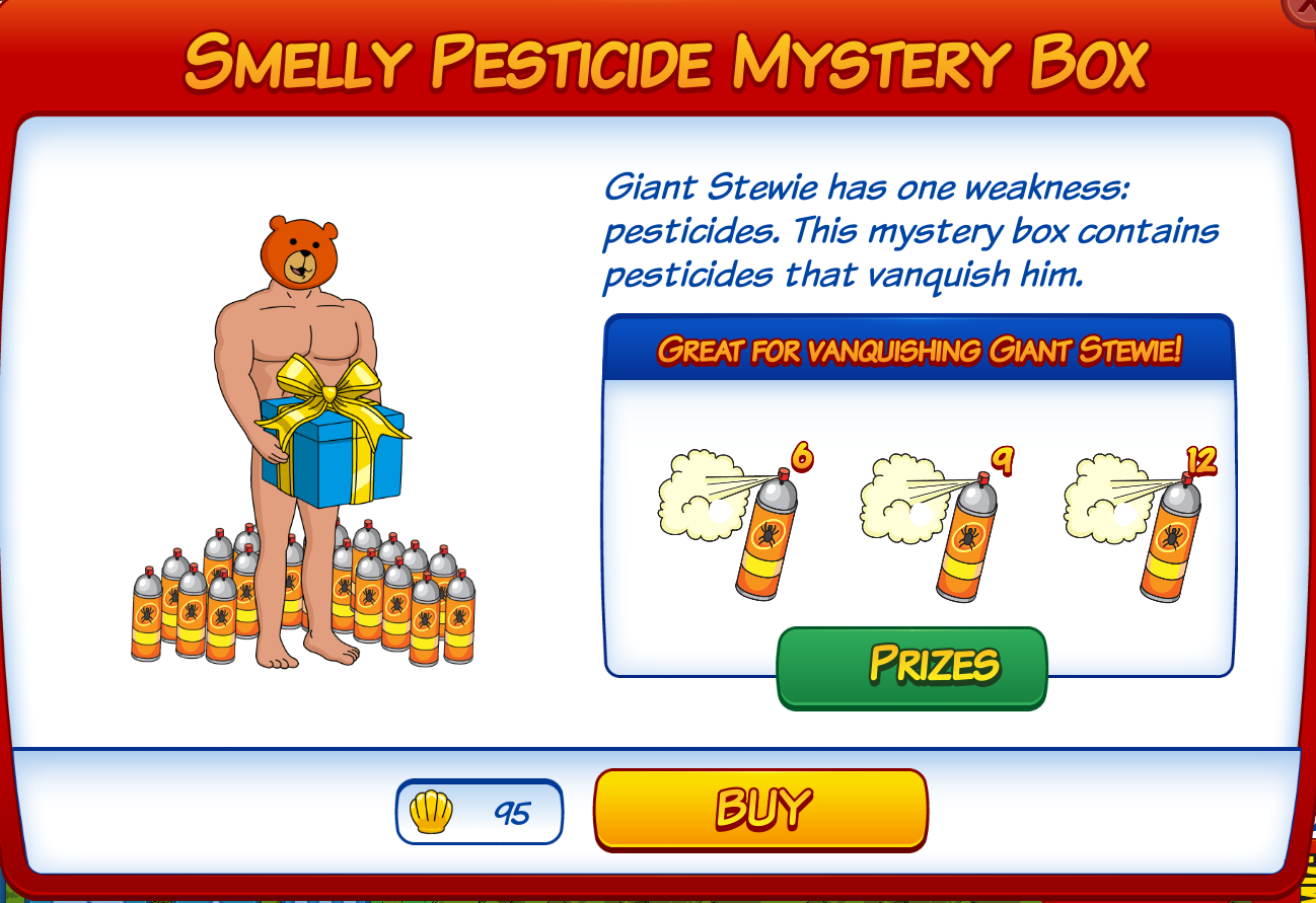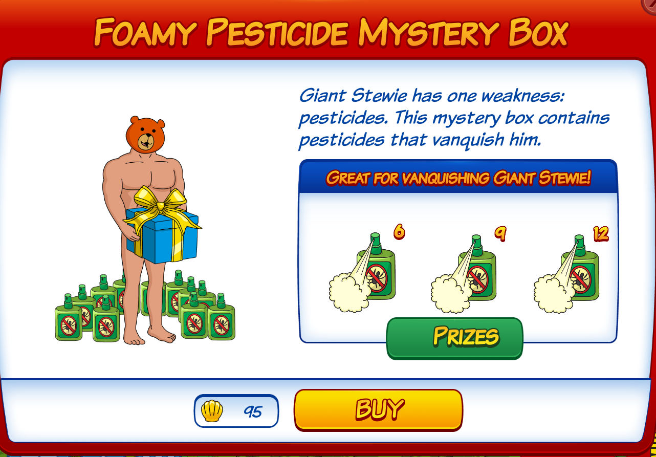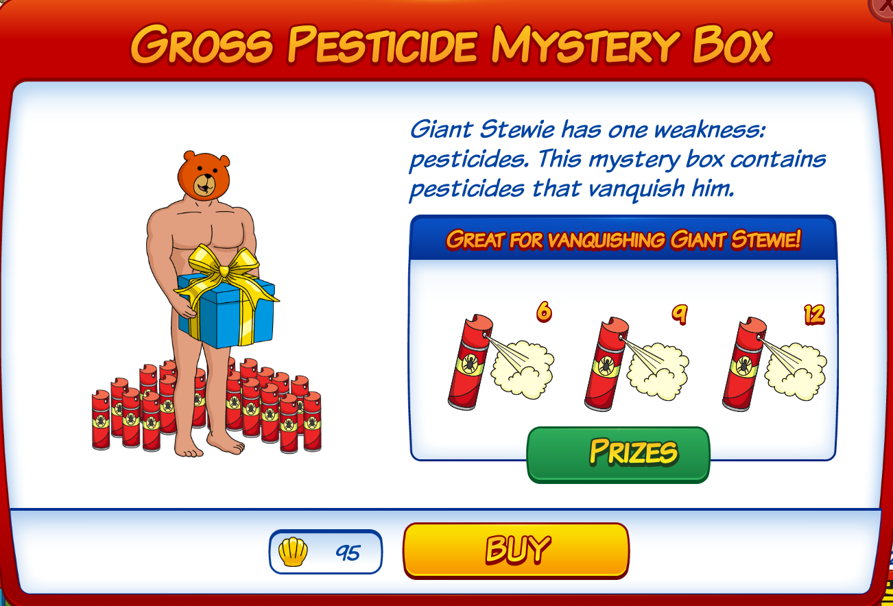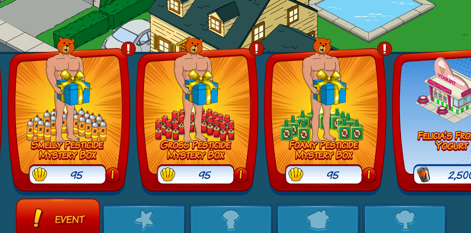 More details will be below the fold, but basically these are designed (as you can guess) to get you more pesticides to help you defeat Giant Stewie. However, they cost clams (95 clams each box) and in my own opinion…NOT WORTH IT. Save your clams! At least for now. If if gets to the last days of the event and you’re just shy of getting George (or another prize you really want) then it might be worth the investment.