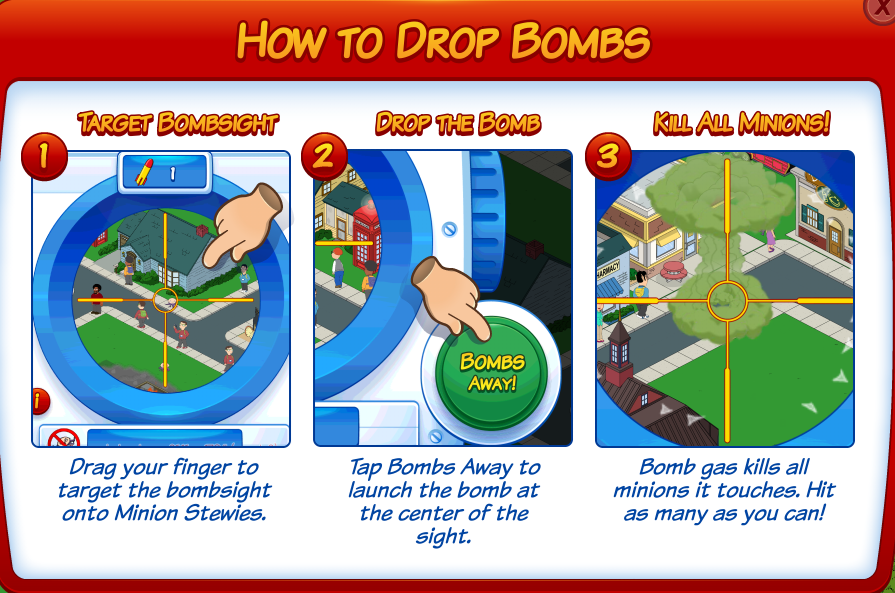 When you first start the update you’ll go through the tutorial for bombing Stewie’s minions…THEY ARE EVERYWHERE! And can only be stopped by Bombs. Peter kicks off this part in the questline called Bombs Away. Here’s the basic details (As always we’ll have a FULL rundown post of the details in the Stewie Bombs soon):