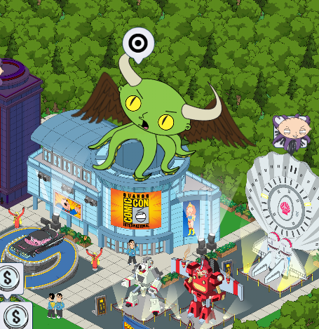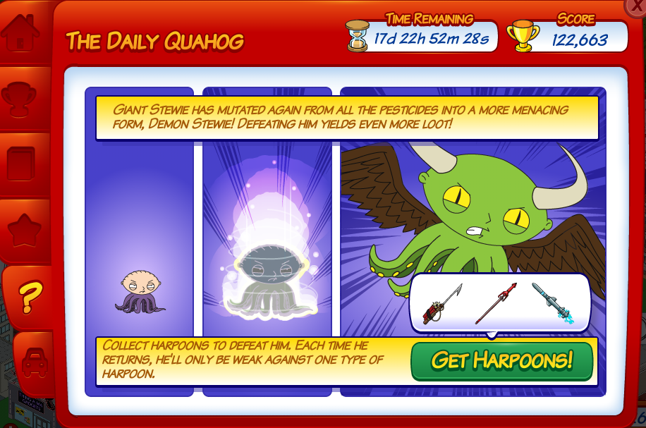 Giant Stewie is no longer in Quahog…instead he’s replaced by Demon Stewie. He’ll loom over your Convention Center and you have to attack him, just you Giant Stewie…only this time with Harpoons!