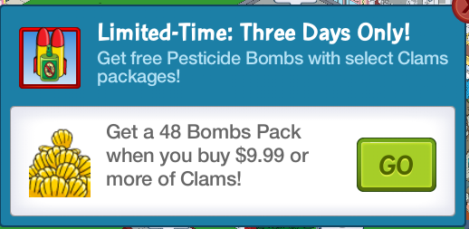 3 day clam sale….spend $9.99 or more on clams and get a 48 Bomb Pack (to help you bomb more Stewies)