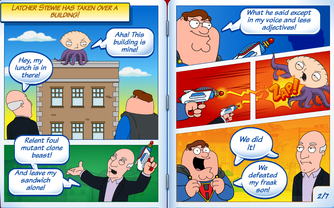 9. The last page never appeared for me, and it looks odd. The last text box is far too large for what they used, and it’s just “Victory is ours!” twice. I think they might have been censored on the last one. I was disappointed there was no final wrap-up action, the last iron baby mission was pathetic. Write knock-knock jokes? Why not one last mission to take out demon stewie?