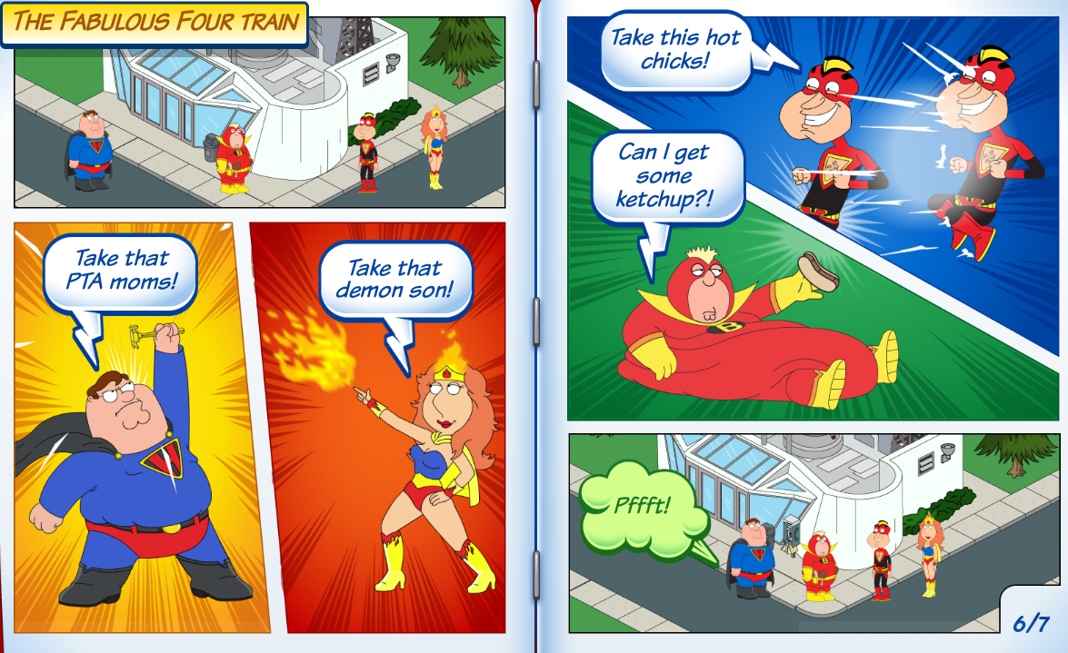 Why did they wait so long to release page 7? I never even got to see it and then the event ended. Had to look it up here. Meh, it wasn’t really an epic ending to the “comic” I guess but overall the event sure was fun! I got everything but the Clamterprise and the 2 really clam-expensive comic con characters and I used all the extra clams I got to buy sons of the brain-damaged horse and Jake Tucker. Wish I could get some statistics on what rank I was on the scoreboard or how many mutant stewies I zapped, bombed, harpooned, sprayed with pesticide, etc. That would be fun to know 🙂