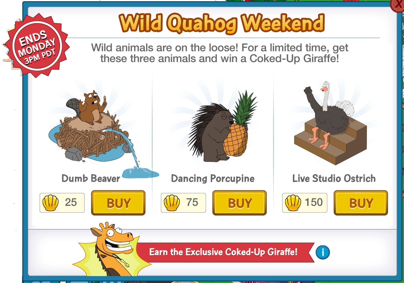 If you want more of the Giraffe, you CAN buy him after the initial “Free” earned one for a cost of 250 Clams each.