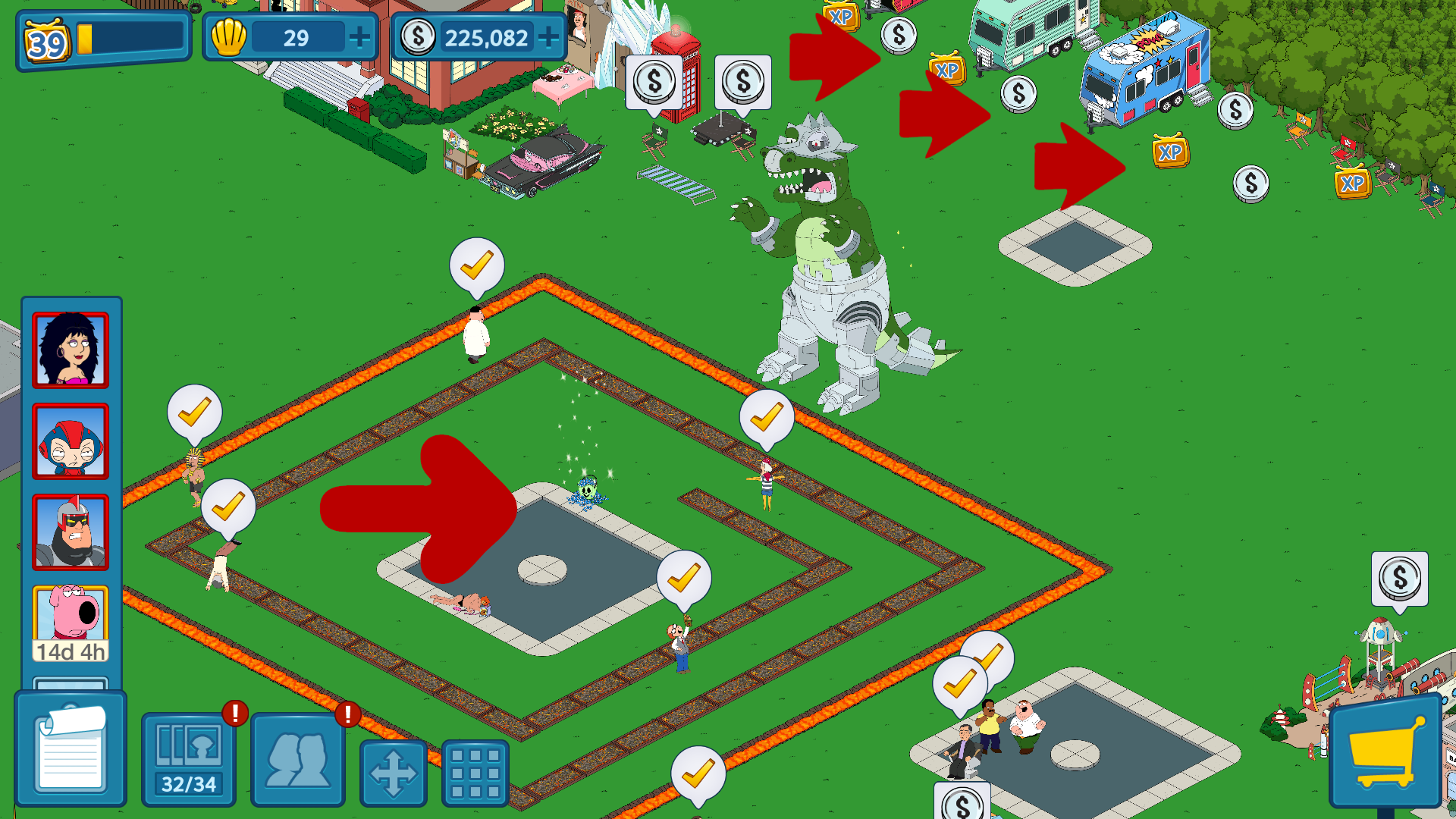 So just as suggested and in the FAQs, I tapped on a few buildings to collect money. After about 4 taps, BOOM…CANDY BUCKET. (See how lil it is?) It was right on one of the only pieces of sidewalk I have left. Sparklies floating out.