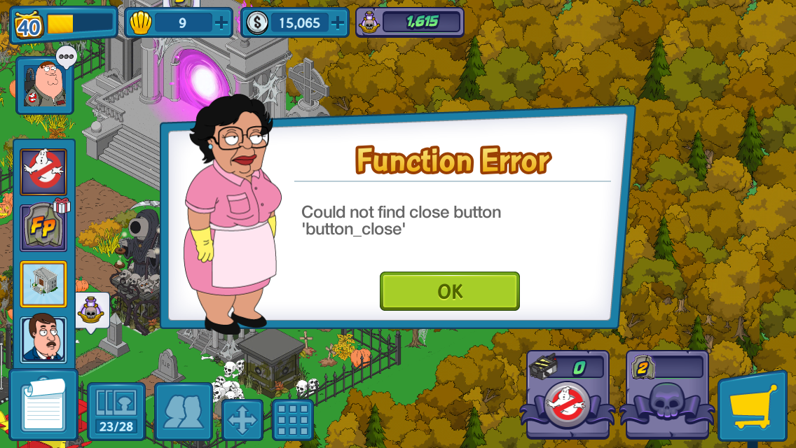 Hi, has anyone had the error message: “Child name modalBG not found” it occurs when I tap on the perfume factory in the Stewie and Mayor West quests. Next I have to collect 4 bottles of perfume but every time I go to do it, it crashes with that error.