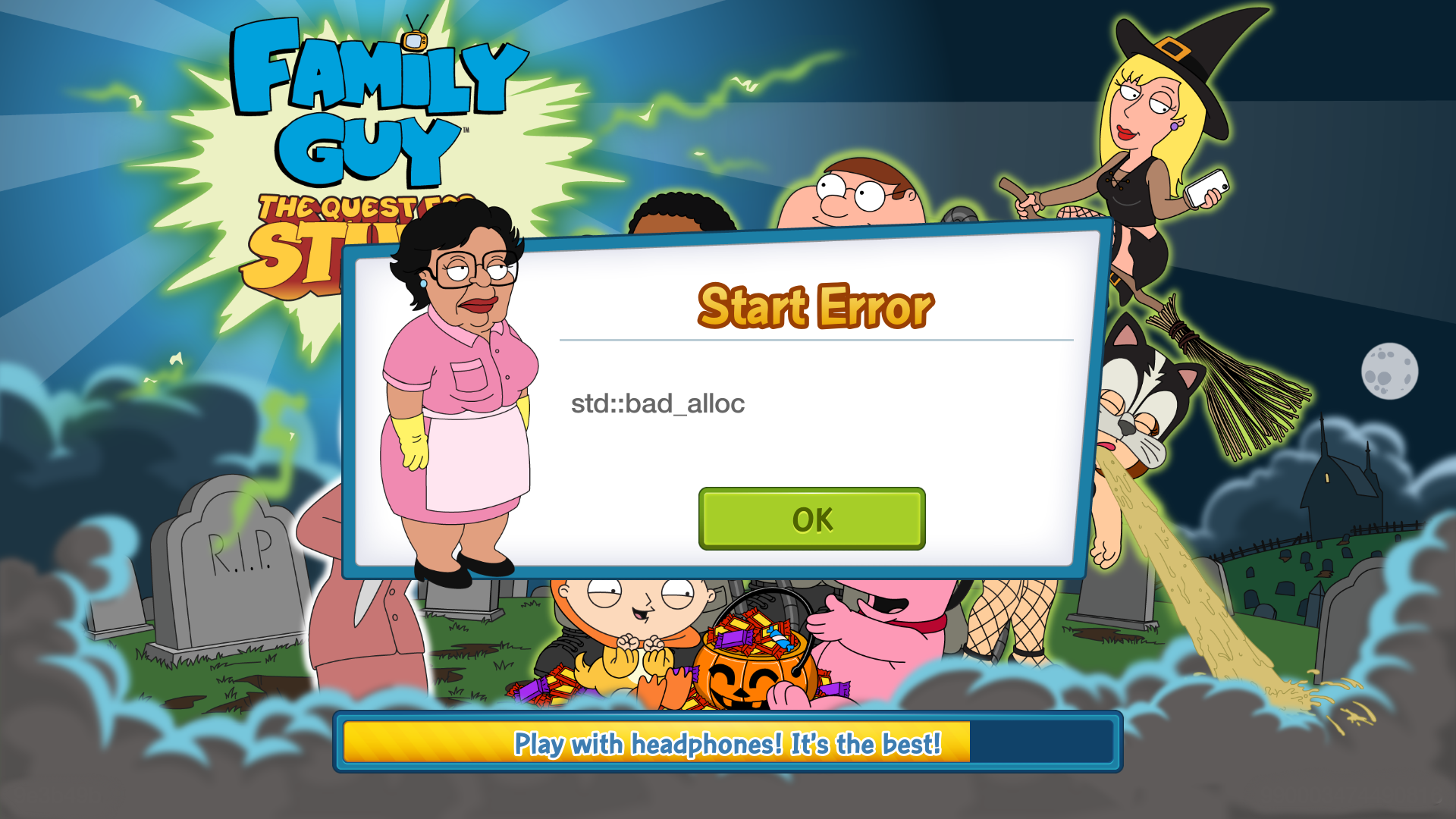 I don’t want to complaine but I have chose to not play family guy for the past few days and just stick with the Simpsons tapped out and don’t really like the show or the game but family guy is basically unplayable because it will not stop crashing so it won’t save anything I am playing on an iPad Air 32gb with a lot of open gbs. Is there anything you know to do to stop the crashing and I also have a really big town and am max level and have all the buy able to free players from king but to George takie to mayor west also have kool aid man and all the characters you can get in this event so far.