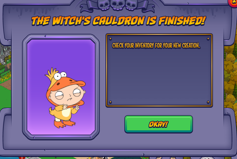 Once complete he can be found in your inventory. Also…if you don’t currently have Stewie you can brew Vampire Duck Stewie and he’ll remain in your inventory until you unlock Stewie. Once you unlock Stewie Vampire Duck Stewie will move from your inventory to Al Harrington’s. You’ll also be able to complete his questline even after the event is over. BUT you MUST brew him BEFORE Halloween is over….