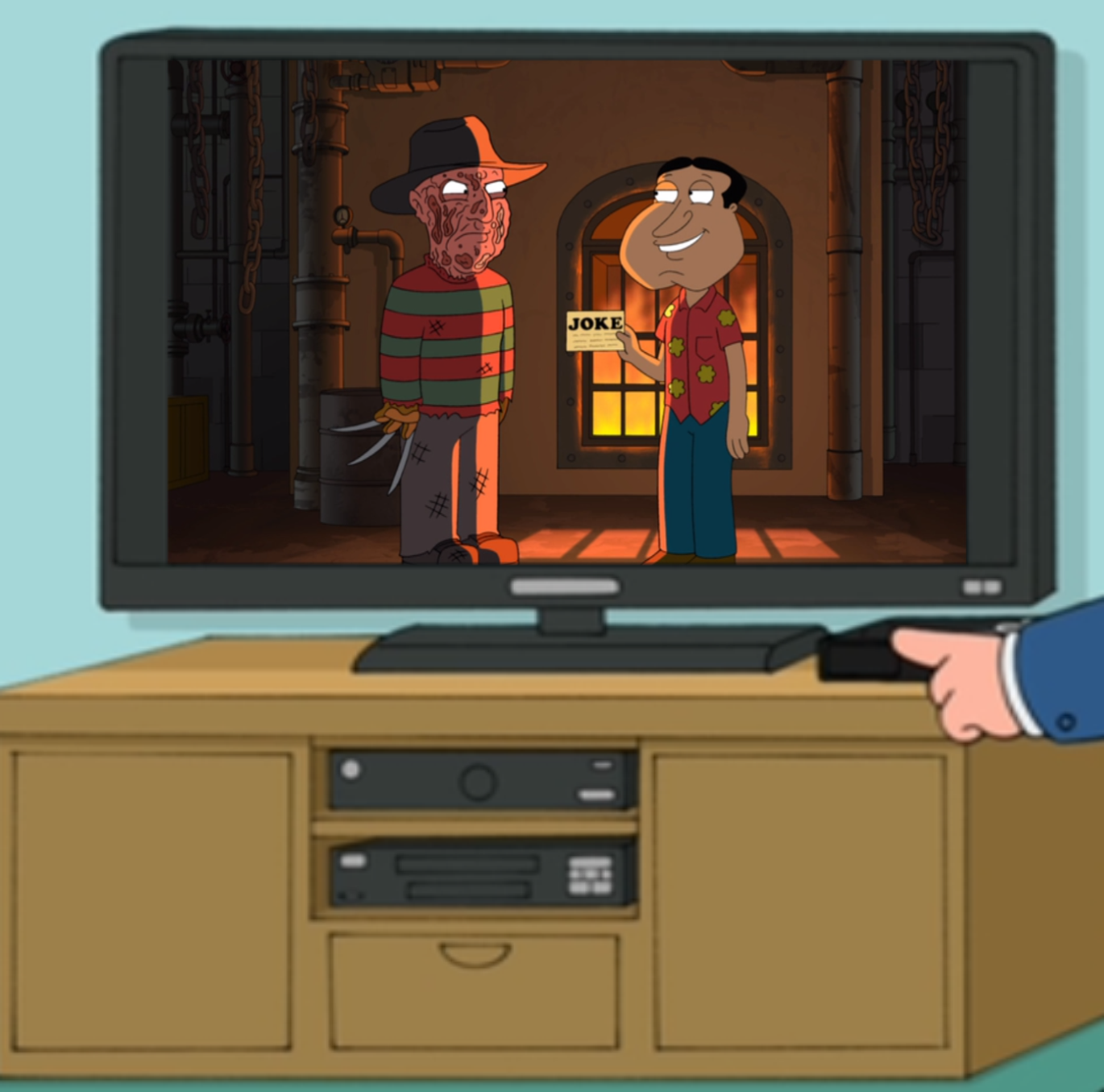 Chris got in trouble at school for telling a joke he learned from Quagmire. Peter goes to Quagmire at the Clam and asks him to retell the joke to him and the other guys. Apparently it is so funny Peter poops. Joe and Quagmire now find this as an amusing way to make Peter continue to poop his pants over n over n over. Quagmire even goes so far as finding Freddy in his dreams and paying him to tell Peter the joke so Peter will poop in his sleep. It works. (You can also see the Furnace in the background of this episode.