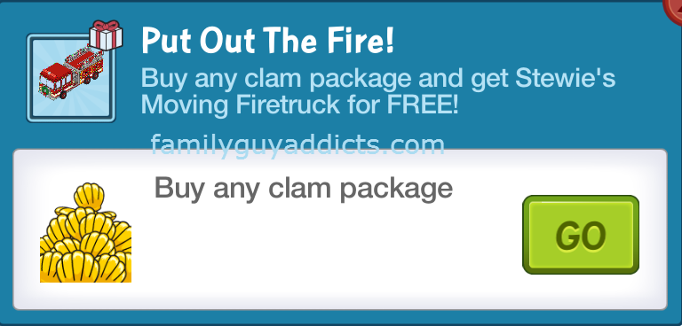 On top of that it seems that lil Stewie didn’t get everything HE wanted for Christmas, especially a Firetruck. So if you are looking to purchase some Clams, you can get Stewie’s Firetruck Free with ANY Clam Package purchase.