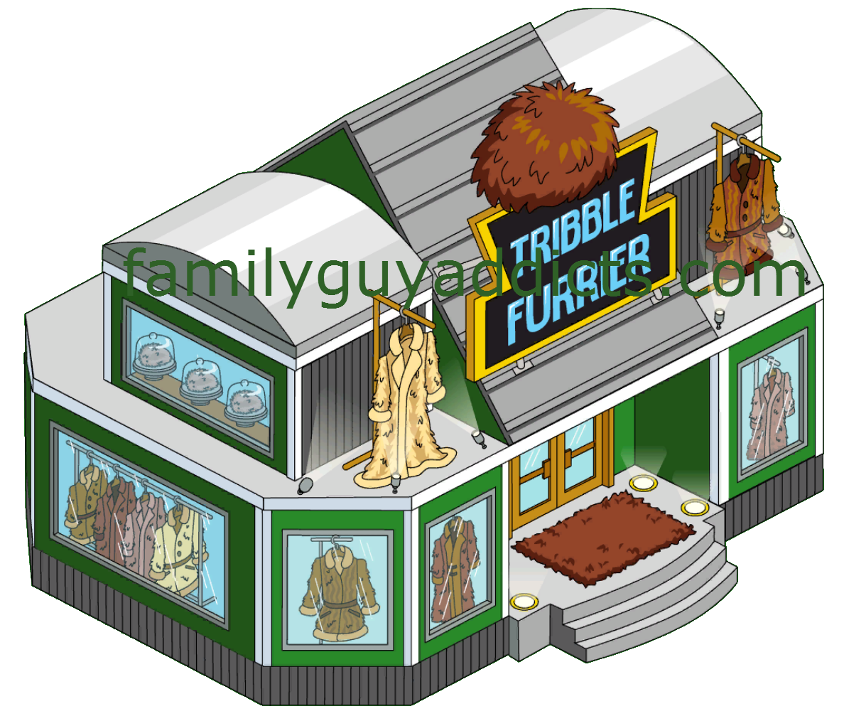Tribble Furrier (Building): Sits on a 7 x 5 base. Pays out 15 Dilithium Crystals & 3 Starfleet XP every 12hrs. This Fur shop has a giant Tribble on top of the sign and a lot of detailed Tribble Furwear in the windows and on exterior. Not sure just yet where I want to put it, but for some reason… next to a Strip Club makes me giggle. Lol.