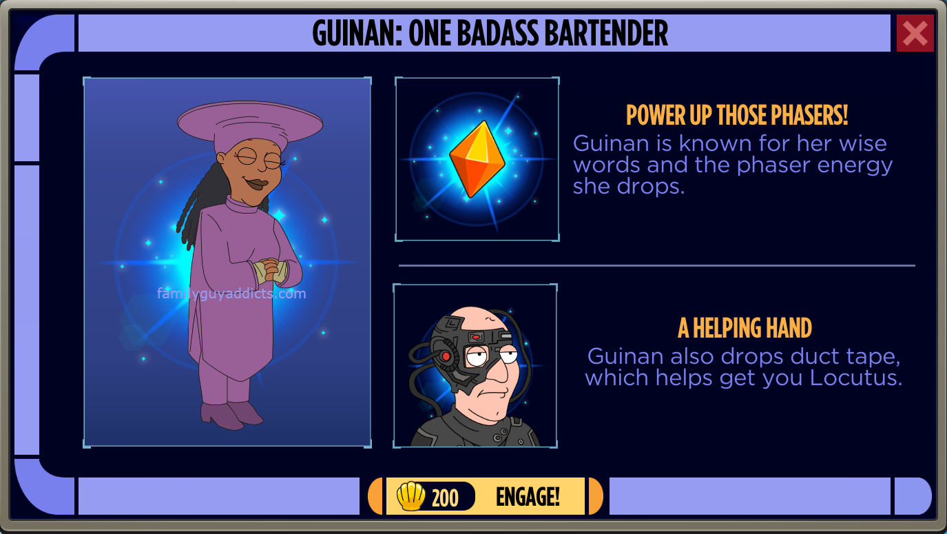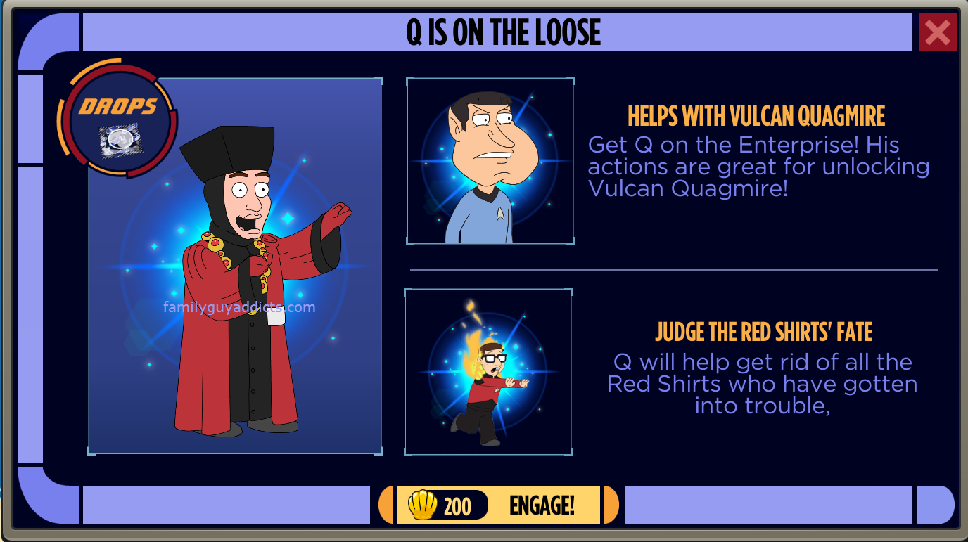 I couldn’t care less about these characters. I’m not a Trekkie and know basically nothing about them, much less have any attachment to them. I find them ridiculously expensive as the key to Meg’s costume, knowing they’ll soon end up as useless as the previous premium characters in the game. With all the frustration surrounding the almost impossible and convoluted, multi-randomized way to get Vulcan Quagmire without any expensive premium purchase, I’ve lost interest. I’m just playing along, but no longer dedicated and working towards goals. They’ve really ruined the fun and entertaining part with the event design. I already have a job, I really don’t need a second grindstone.