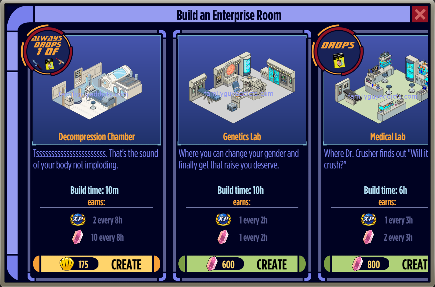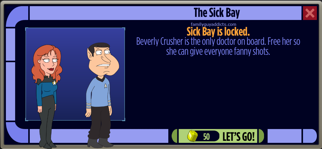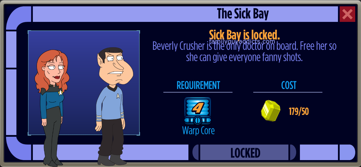 I am a huge Star Trek fan and I have played FGTQFS since the beginning. I have really enjoyed past events. The main story lines were always achievable with vigorous freemium play and I would usually treat my self to one clam purchase. I was super stoked to see Star Trek come to Quahog, but have become VERY frustrated with the game. I play a minimum of 10 times a day (I am blessed to have a job with wifi access and frequent breaks 🙂 I have my characters on constant missions and have build every freemium room/item. The problem is that I have been unable to unlock any of the characters nor skins without paying clams. You simply, even with diligent play, cannot unlock them in time. This week, I am less than halfway on the Mind Meld for Dummies and Space Condoms. Without the purchases characters or rooms you can’t do it. I have had Riker searching non stop for life support energy and am less than 1/2 way there. It took 8 days to accumulate the 50 needed to unlock Sick Bay. After a week of diligent play, It would still cost me $30 to unlock Vulcan Quagmire and Dr. Crusher–and that still wouldn’t let me unlock the holodeck this evening as you can’t even buy life support energy!! So frustrating. This was a really cool event but as usual Tiny Co is making it impossible for freemium players to play along and I have dumped enough money into this. Ugh!!