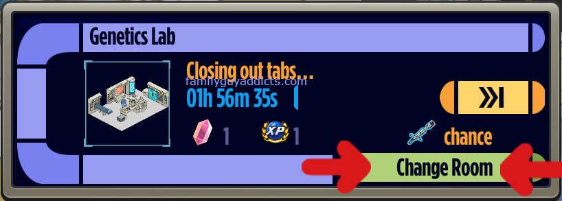 The rooms seem to have a decent drop rate this time. I had to use the swap trick to get Quagmire’s books (swap for 1 guaranteed every 6 hours, or leave sit for a chance at 1 every 3 hours), but the drop rate on the Genetics Lab seems to be good enough to not be worth using the room swap (you get 5 chances in the time it takes for one guaranteed swap).