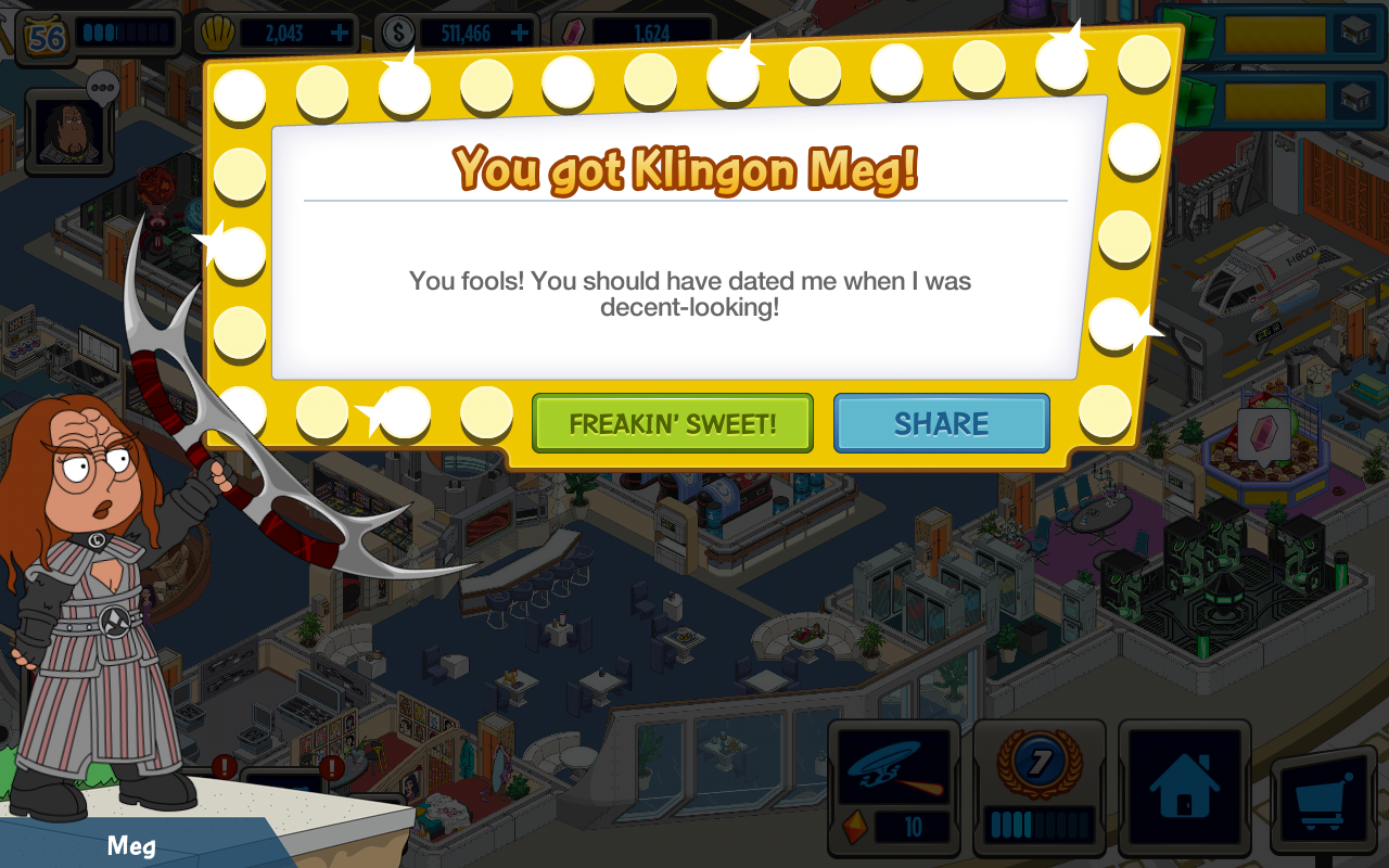 Along the way you’ll unlock skins/costumes for your favorite residents of Quahog…and Meg! These costumes will help you earn items needed to unlock other characters and more Dilithium Crystals, the much needed event currency for this event! During Phase 4 (week 4), there are two costumes you can unlock and one of those is Klingon Meg. Let’s take a closer look at this costume and see just what happens when you unlock it in your Quahog…