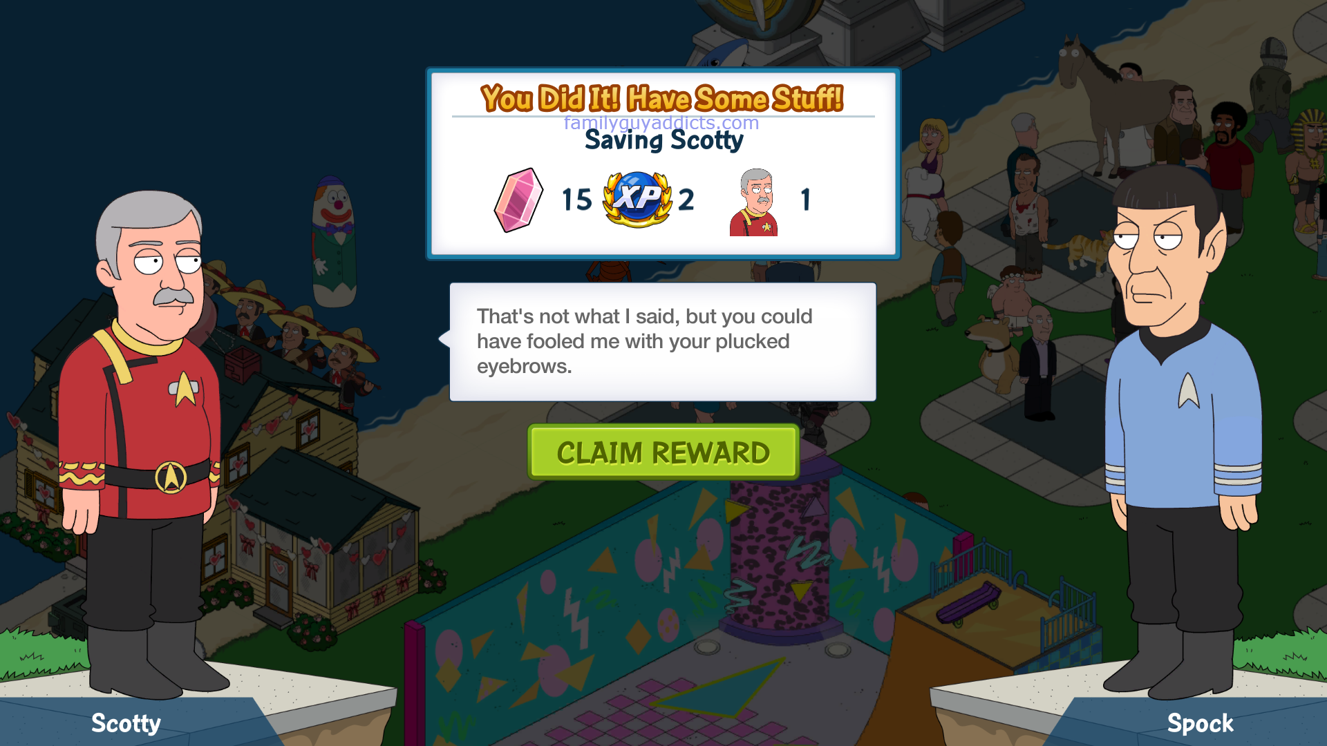 Typical TinyCo has snuck in a weekend “deal” to bring the option of two more Characters from Star Trek: The Original Series into our Quahog’s. So just what is the offer? This is a combination of Acquired Character and Clam Characters.