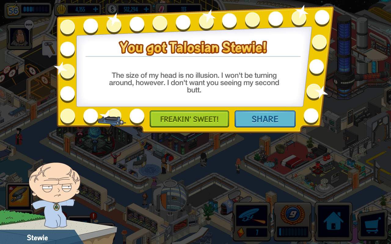 Talosian Stewie is the last piece of the Trekkie Griffin puzzle & unlocking him (along with the others) will earn you 25 FREE clams! Freakin’ Sweet!