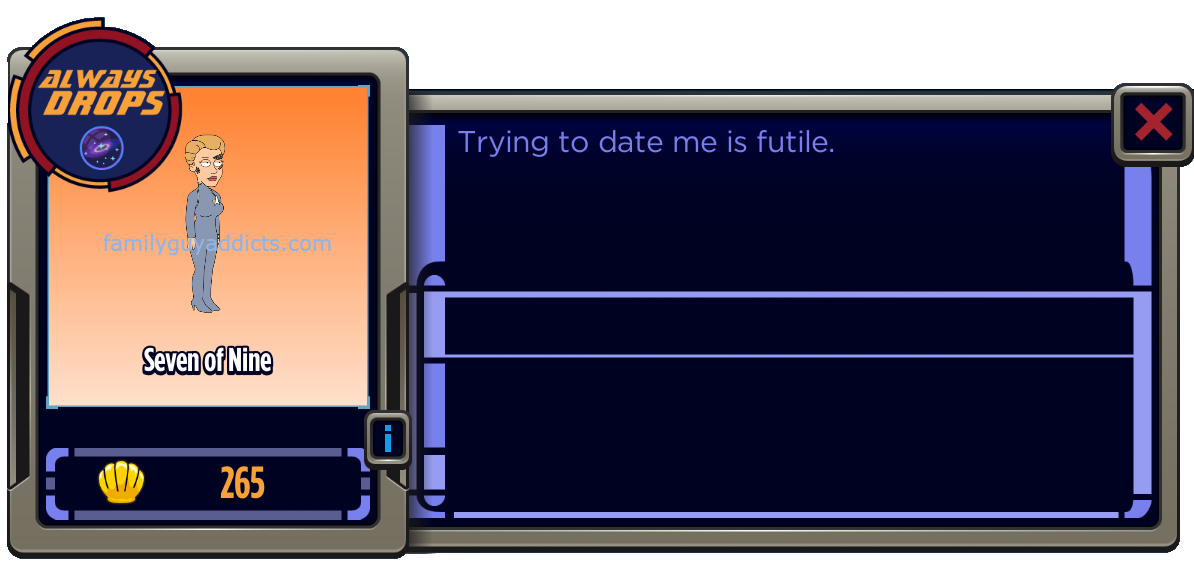 Would like to have seven of nine in my collection however not worth 265 clams for a character that is unemployed in two days time! Am collecting dark matter towards Uhura instead.