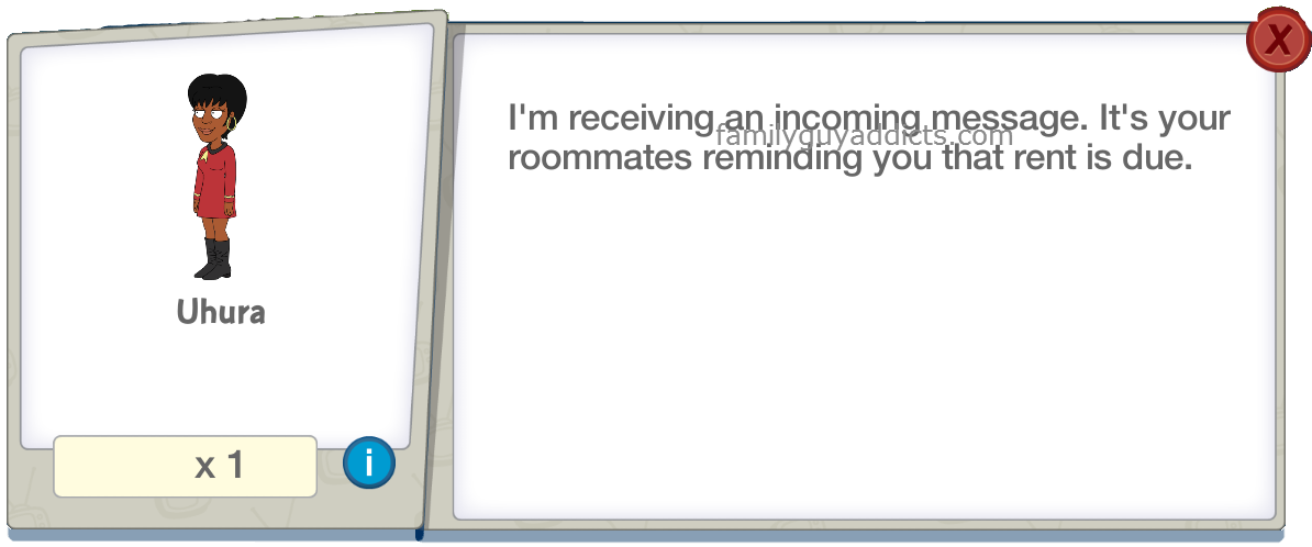 I’m 19 ore from Uhura so I don’t think I’ll be getting her. The room switching “trick” does not work. When the Super Rad Cargo Bay finishes, it pays nothing. Unless I get really lucky today, I dont see it happening….