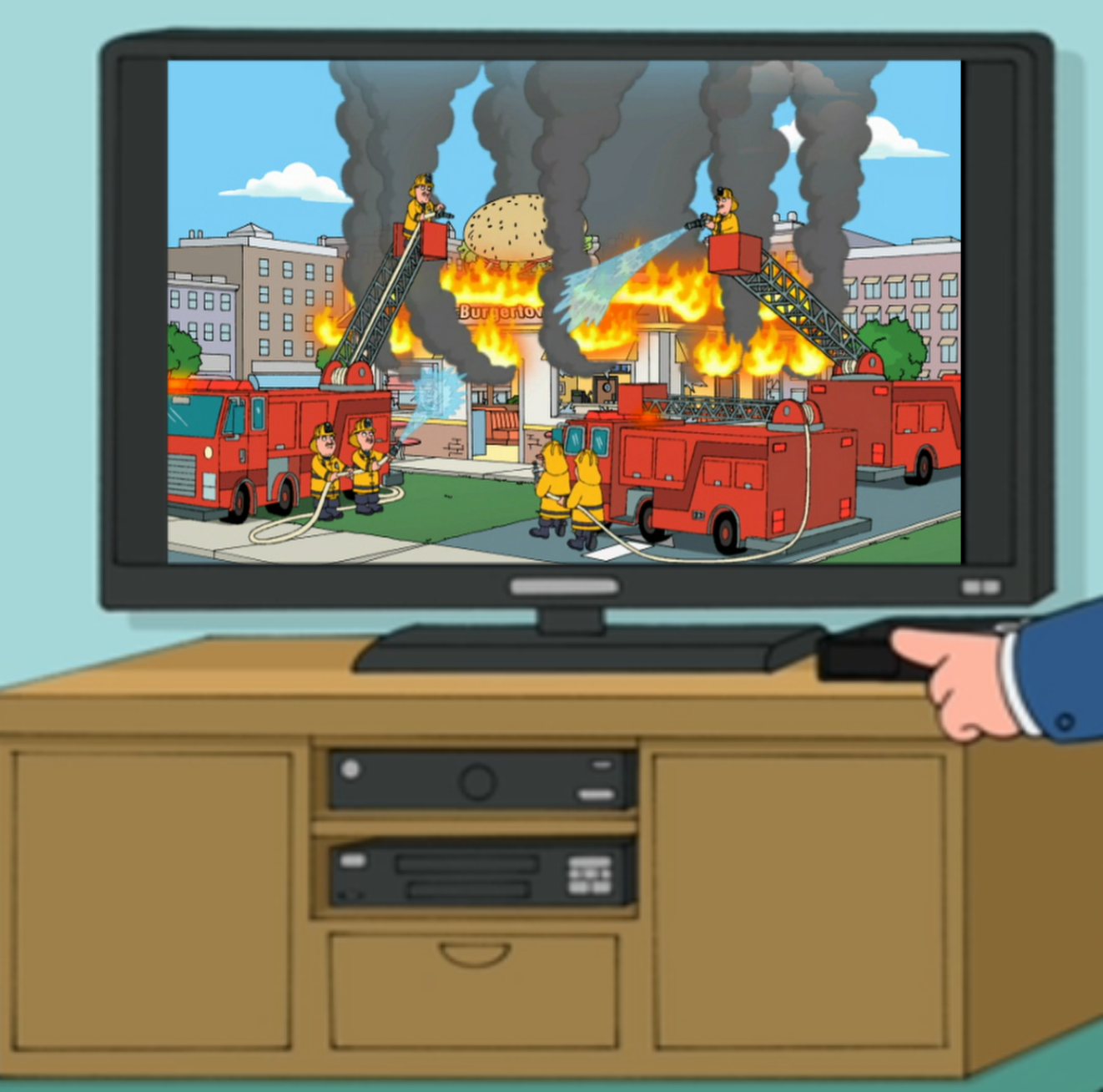 Later on, while him and Brian are walking around town, they stumble upon McBurgertown on fire. (Looks like a familiar building fire, along with the Firemen too.)Building Fire