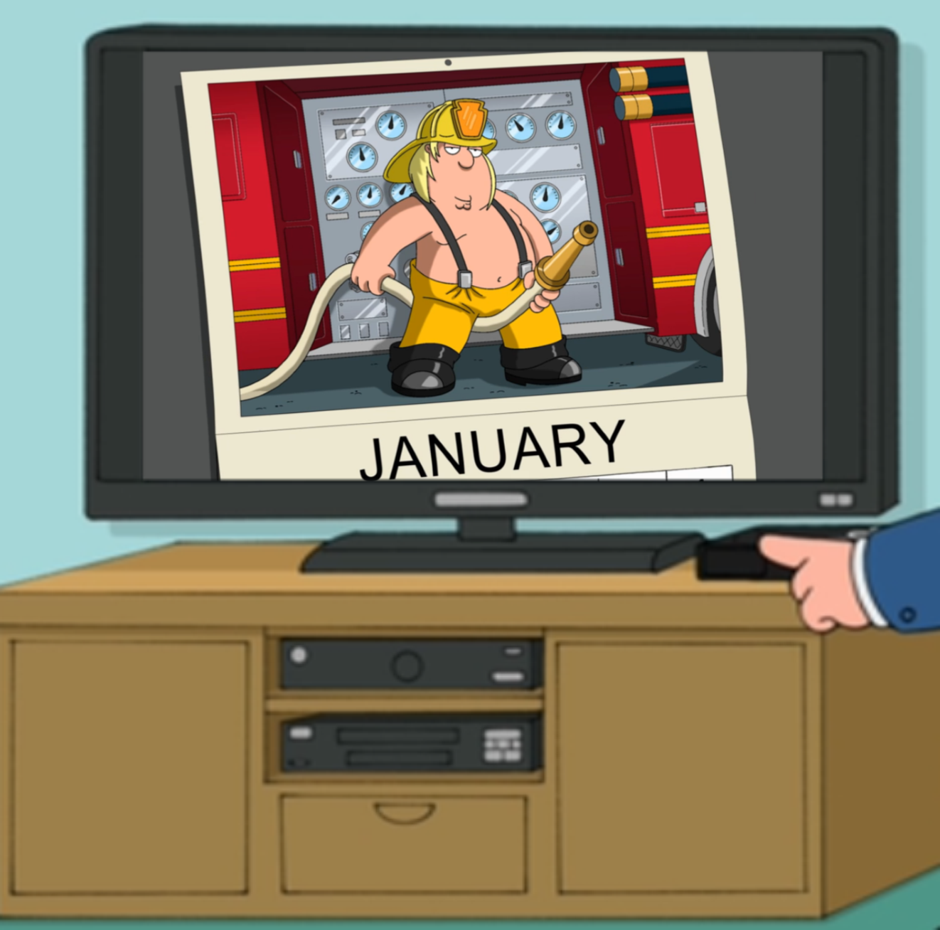 Peter sees Chris struggling with women and wants to try and help him. So he takes him to the Fire Station #162. He wants to take some “Sexy Calendar” photos for Chris because chicks dig Firemen. Cut to the Calendar shoot of “Sexy Firefighter Chris”. (Along with more of our Firefighters. Lol.)Sexy Fire Fighter Chris