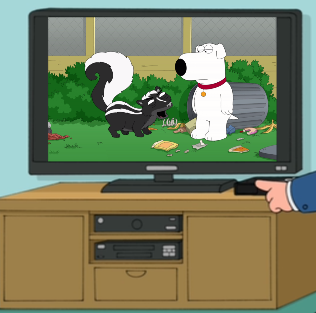 Brian is outside in the fresh air setting up to read his book when he hears something knock over the trash cans. When he goes over to investigate, he finds a not so very nice Skunk.