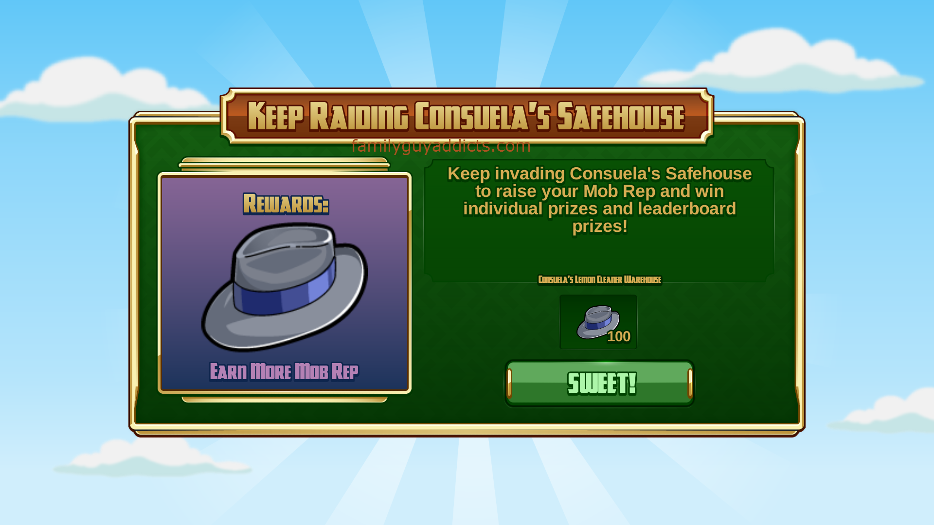 As you are progressing through the questlines, Mob Mentality Part 6, you will see Fatfather Peter trigger Warehouse Wars. You will also get a pop up telling you about Kingpin Consuela’s Safe House. Once you tap “Ready” in the Pop Up you will see an additional plot in the Event Area open up that looks like a Warehouse. It will have a GIANT ! over the Pinata at the Entrance.