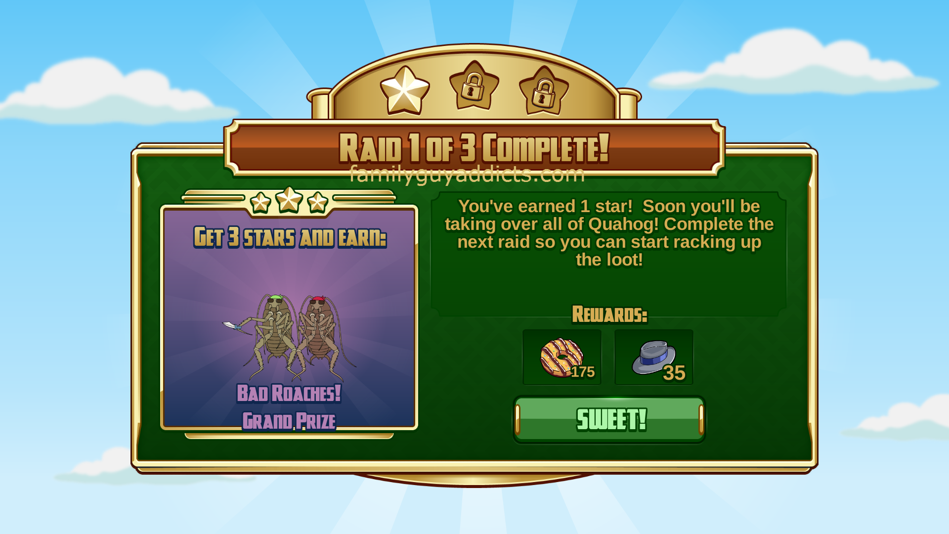Raid #3 Reward 3 Stars and Bad Cockroaches Decoration (I also got 225 Cookies & 45 Fedoras. Verifying payouts.) Payout is 375 Cookies and 75 Fedoras.