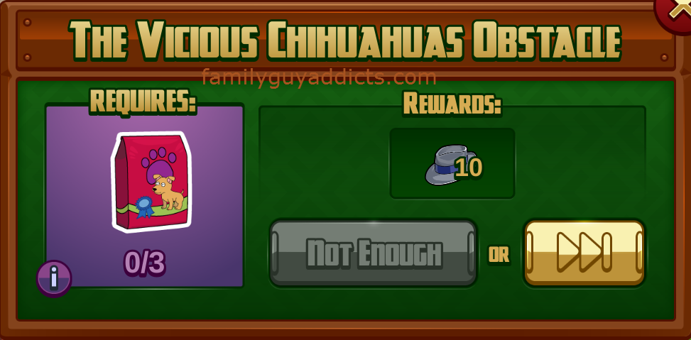 - “The Vicious Chihuahuas Obstacle”: You will need THREE Bags of Dog Food to unlock it. (Dog Food from Make Mort Retreat Cowardly- Uncommon) Reward: 10 Fedoras