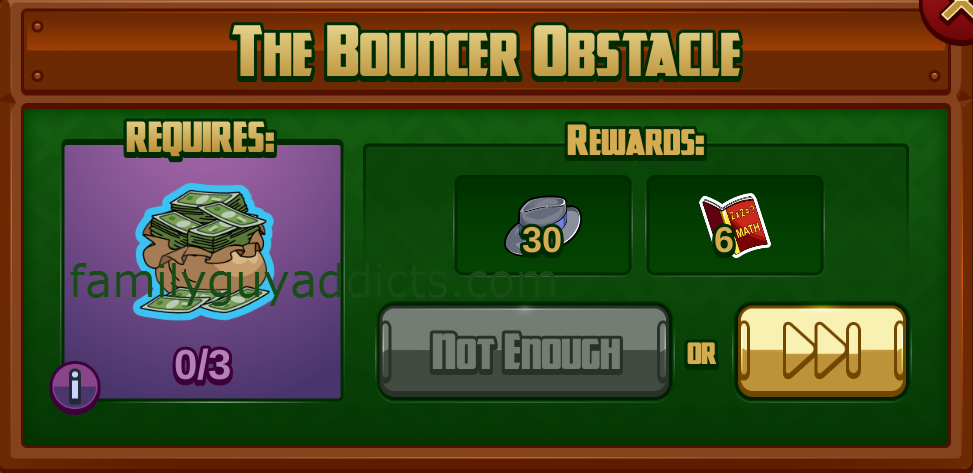 - “The Bouncer Obstacle”: You will need THREE Sacks of Money (Get from Joe Offer Protection-4hrs OR Peter Search Couch for Spare Change-4hrs OR Quagmire Shake Down Clients-4hrs). Reward 20 Mob Rep & 6 Math Books.