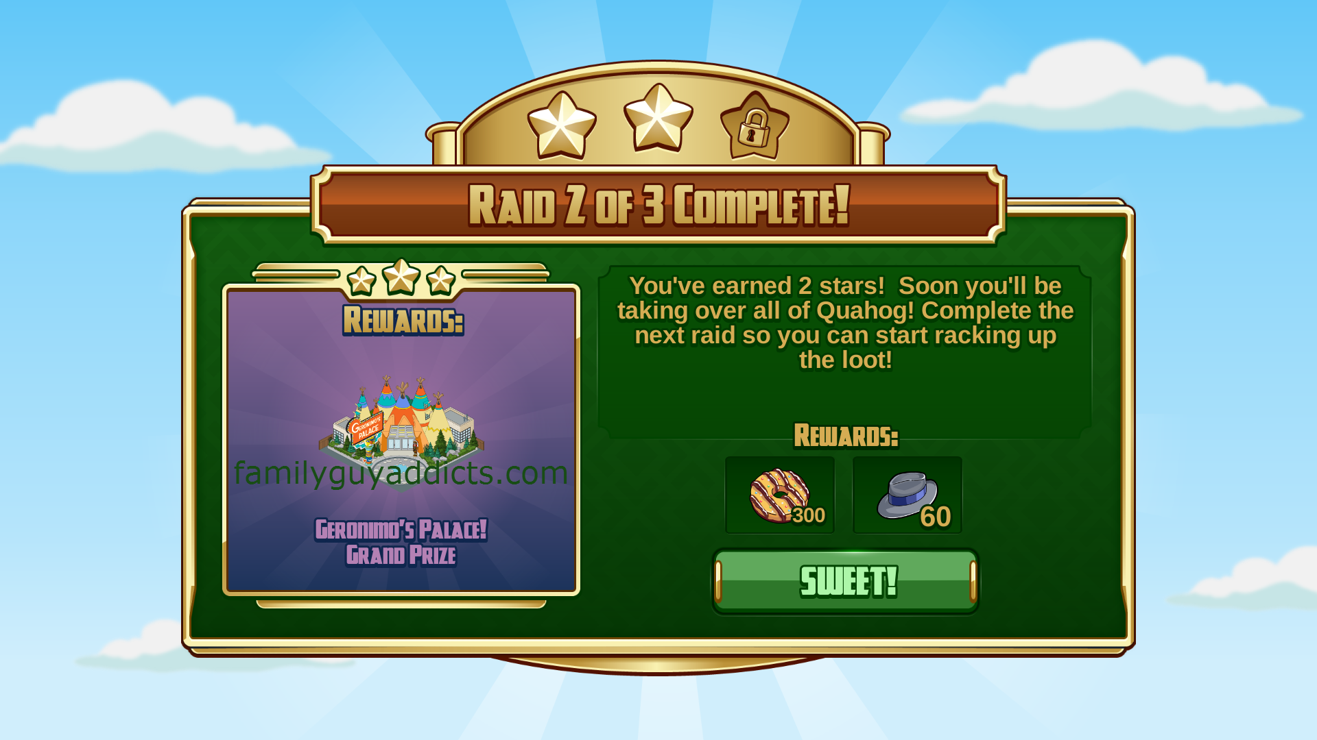 Raid 3 0f 3 Completed Reward: 3 Stars, Geronimo’s Palace, 450 Cookies & 90 Mob Rep