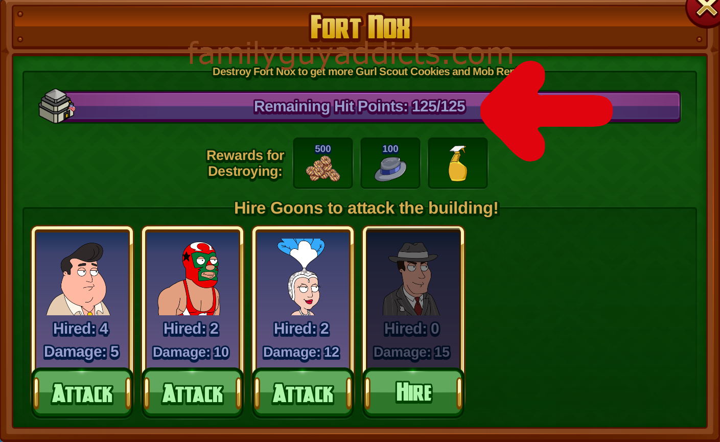 Damage: This is where it will tell you just how much Damage this Goons Attack will do to Fort Nox. Right now, mine is showing 5. That means for every Wiseguy Goon I send to Attack Fort Nox, 5 Damage will be subtracted from the 125 Hit Points on Fort Nox.