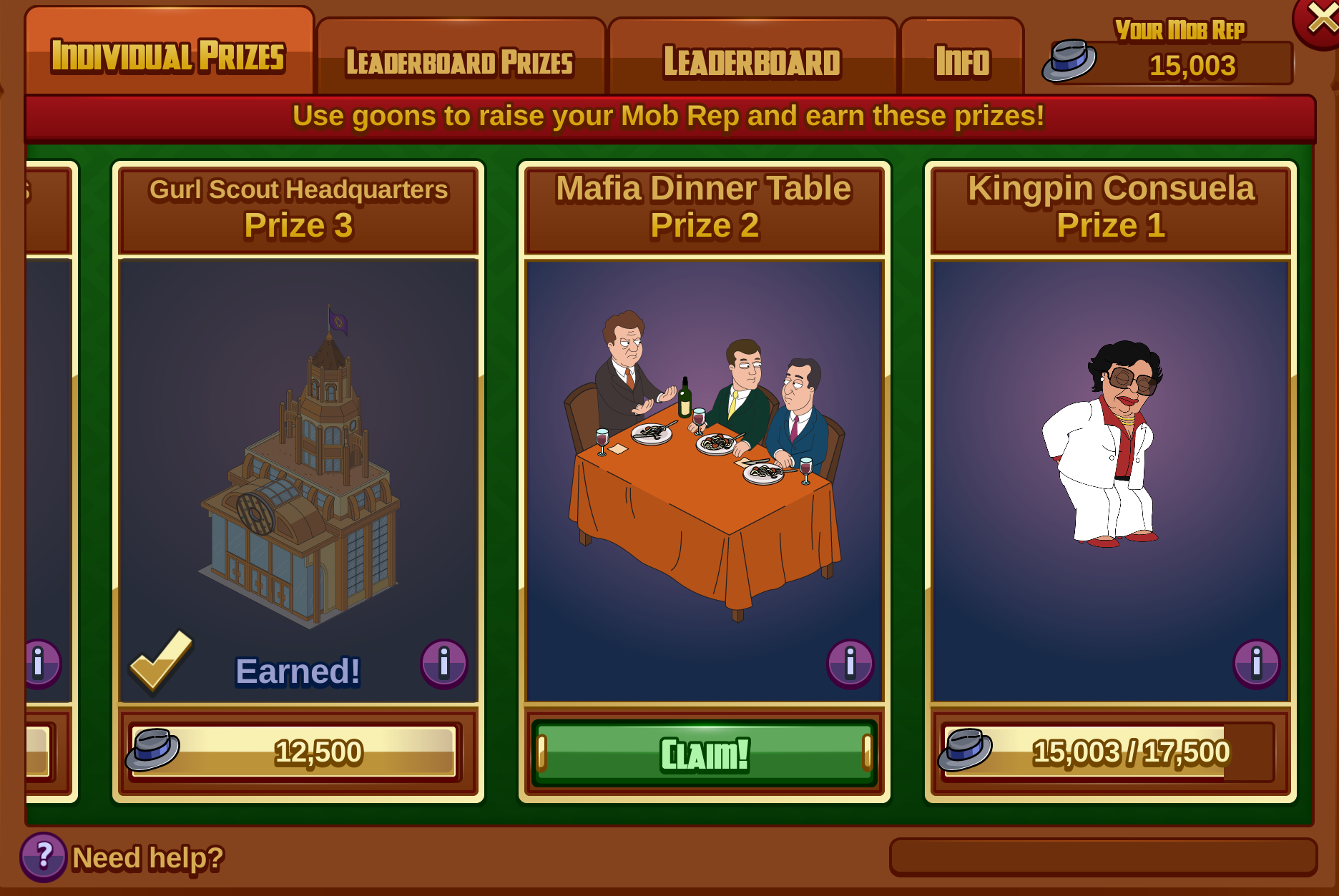 When unlocking the prizes you’ll have to claim them from the prize group in order to get them in your Quahog.  Once you’ve earned enough Fedora Mob Rep 1 to unlock the prize you’ll see this popup: