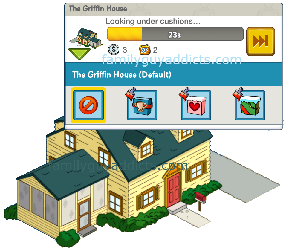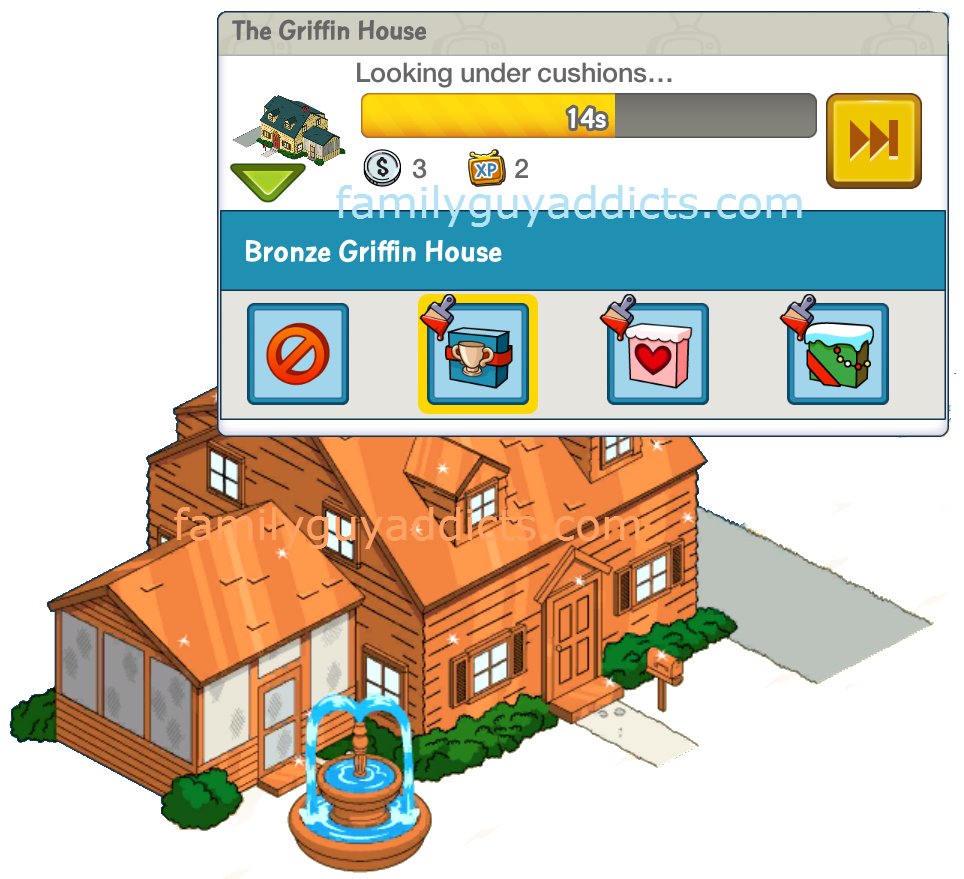 18. I started off with the bronze house…until the crashing. Wound up with Zoot Suit Stewie. My prize pop-up just had the burst thing on it. No exclamation mark from Peter; I just looked around until I found it in Al’s and that’s how I figured out what I earned.