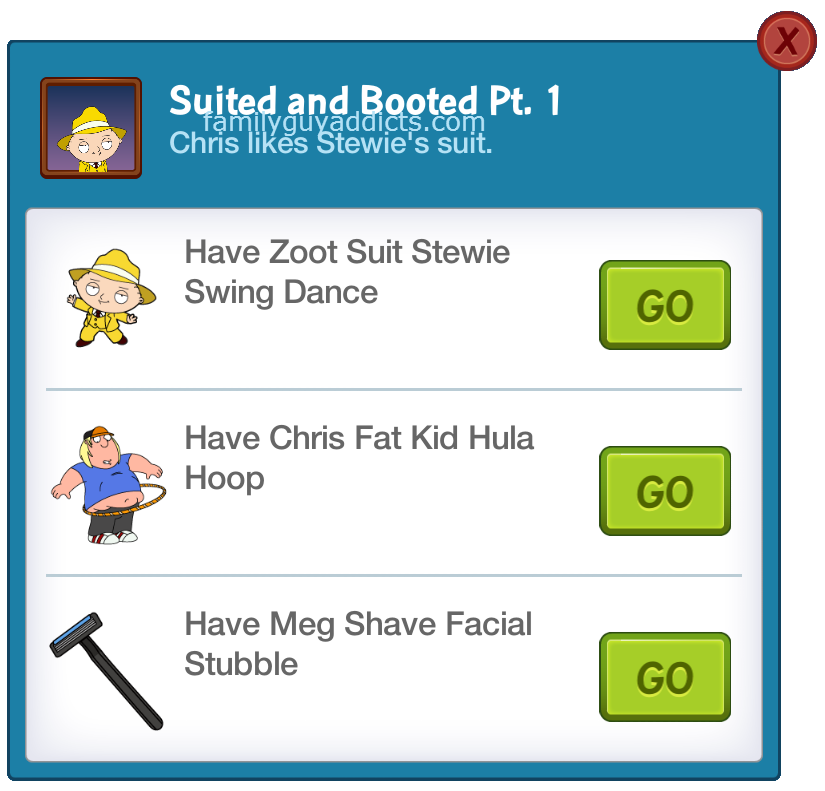 You're a Winner! Zoot Suit StewieZoot Suit Stewie: Once you see the Winner Pop Up, you will go into your game and notice that Peter has a ! above him. Tapping on him will help you locate Zoot Suit Stewie. First it will open a Task.