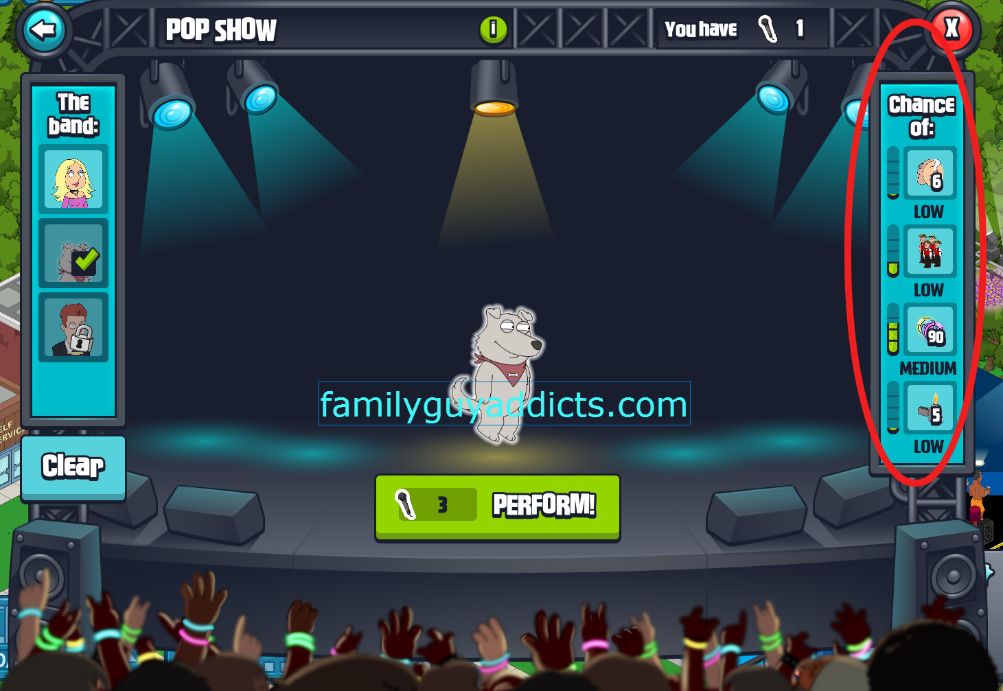 All I know is that i need microphones for the Spooner stage and just are not getting them fast enough, and will have to await 24 hrs for the Meca Astley to reset because Peter alone cant beat level 3x. (freemium, only have Peter) and, the stage is locked up awaiting Rick Astley. So no concerts and no encores, and no spooner, so I cant get the Trench Coats for Rick. For a music fest there certainly is not a lot of music going on! Finally got New Brian today, so I have another character waiting around to rock!