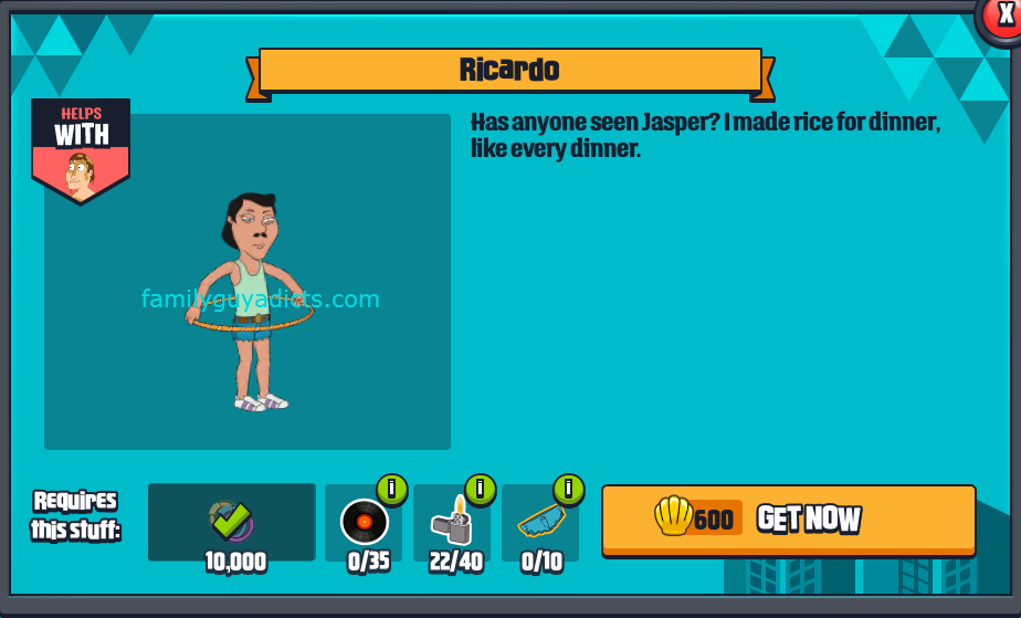 Tapping on “GET” below Ricardo’s image brought you into his information screen and the list of items you would need to collect to bring him into your game.